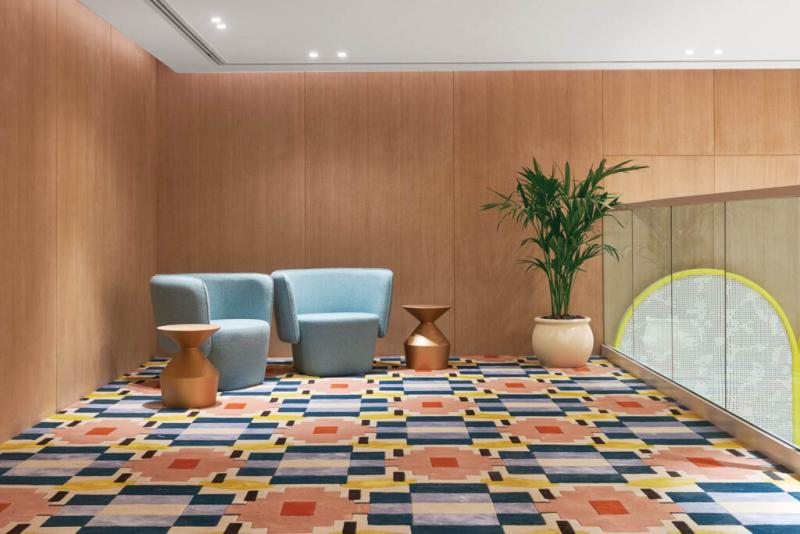 комната с ковром с геометрическим рисунком и синими акцентными стульями