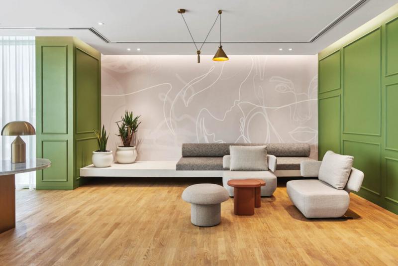зона отдыха с серыми креслами и зелеными акцентными стенами слева и справа