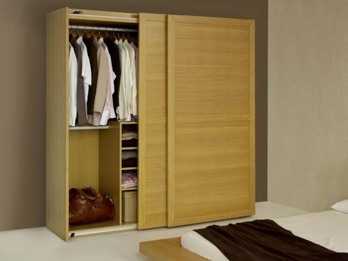 Это полноценный шкаф с дверцами, которые ездят на колесиках туда-сюда по специальной «рельсе». У него есть потолок, пол и задняя стенка. Такой шкаф можно переставить или перенести в другую комнату. Он хорош, если в квартире очень высокие потолки, и делать встроенный шкаф до потолка не имеет смысла. Однако он имеет четкие размеры, поэтому может подойти не в каждую квартиру. Перед покупкой нужно внимательно померить все стены.
