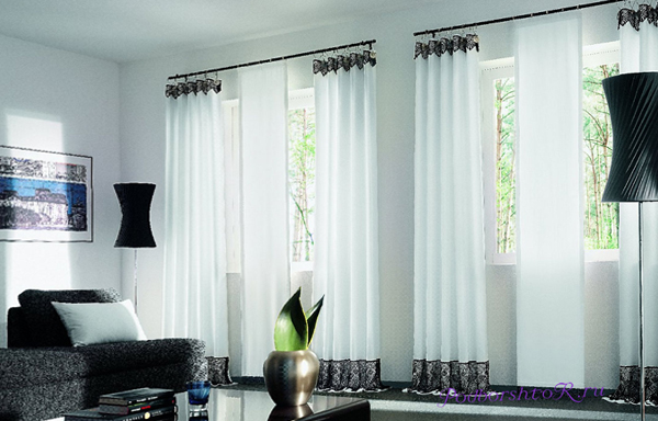 Таким образом, наиболее предпочтительным выбором станут шторы из натуральных материалов – вариации из хлопка, льна, шёлка и других растительных волокон. Тем не менее, ничто не мешает вам выбрать ткань, более подходящую к общему стилю вашей гостиной.