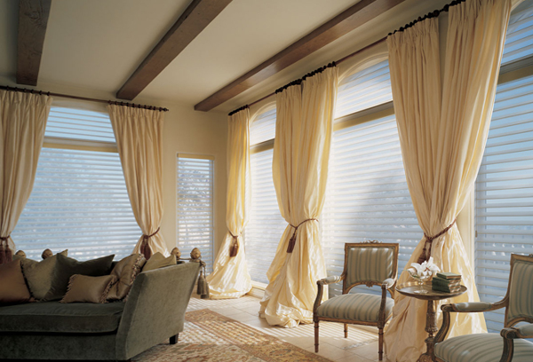 Шторы для такого стиля подойдут объёмные, с драпировкой. Но не забывайте и об обычных, самых простых шторах, которые можно умело сочетать с римскими.