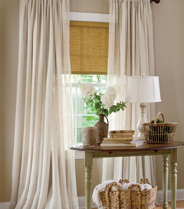 Затеяв обустройство зала в эко-стиле, обратитесь к шторам, выполненным из натуральных материалов, таких как хлопок, лён, шёлк и пр.