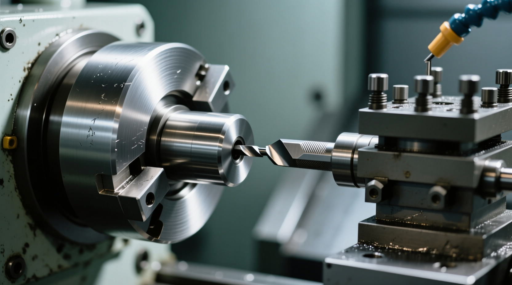 Крупный план рабочей зоны токарного станка с ЧПУ: видны шпиндель, зажатая металлическая заготовка и инструмент в револьверной головке. Поверхности — без надписей, наклеек или логотипов. Освещение — функциональное, чётко подчёркивающее текстуру металла и точность компоновки. Фон — размытый, без деталей интерьера.