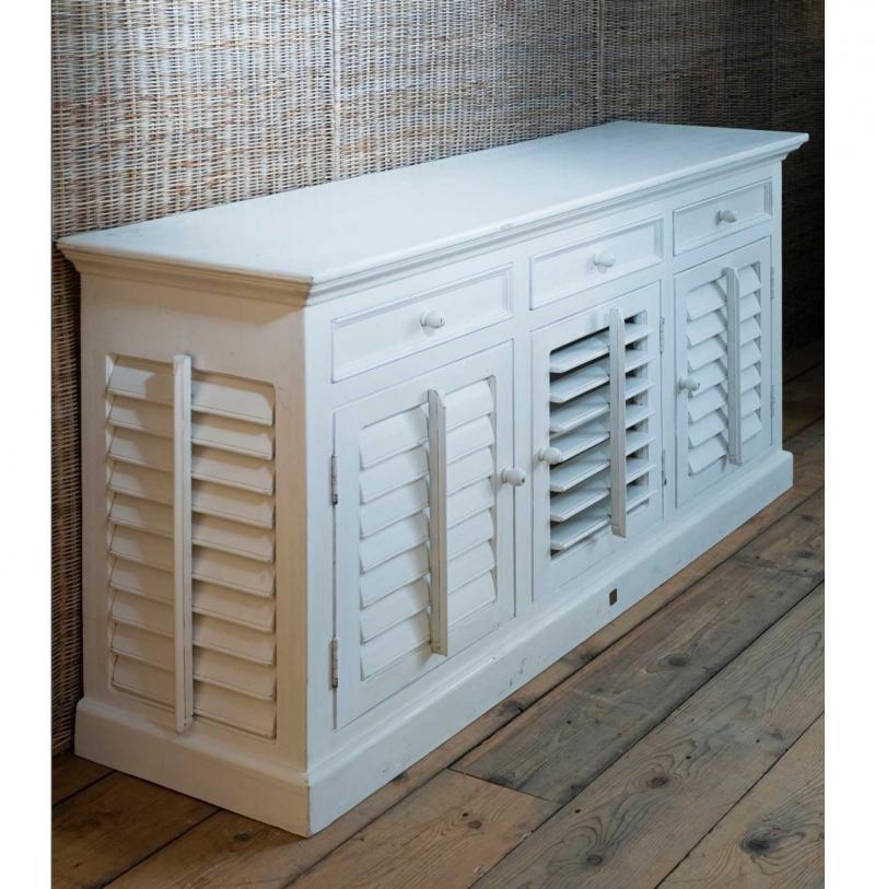 - Newport от Rivera Maison. Это модель длиной немного меньше 200 см с 5 выдвижными ящиками и 4 отсеками. Выполнена в традиционном белом цвете, столешница неокрашенная. Интересное решение для просторной гостиной, спальни, домашнего кабинета.