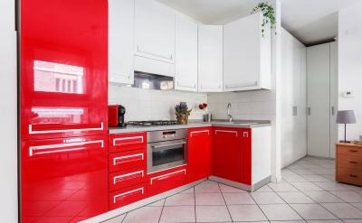 Здесь можно дать волю фантазии: используйте напольные шкафы и буфеты (обычные или угловые), не ограничивайте себя в выборе расцветок и текстуры фасадов. На большой площади яркие и даже темные цвета смотрятся выгоднее. Это же верно и в отношении глянца.