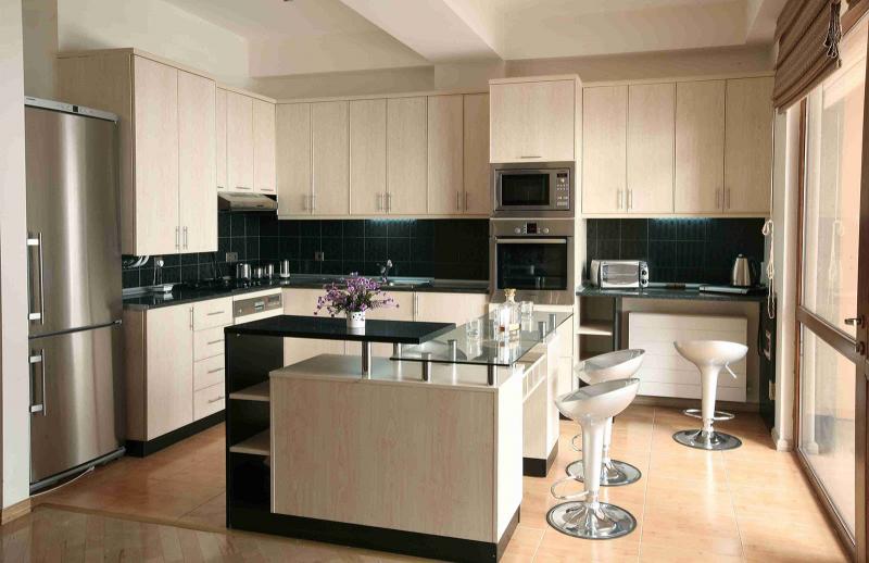 Угол столешницы может быть скошен, так как на удобстве перемещения по кухне это отразится крайне мало. А вот саму столешницу будет использовать удобнее, особенно если именно в углу вы разместите угловую раковину для мытья посуды.
