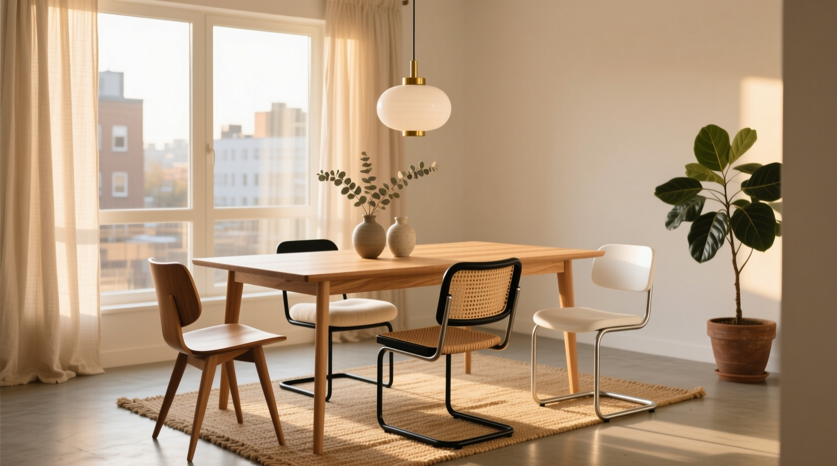 Обеденный стол редко существует в интерьере изолированно — его воспринимают в связке со стульями, освещением, текстилем и даже цветом стен. Вот несколько проверенных приёмов, которые помогут создать гармоничную композицию.