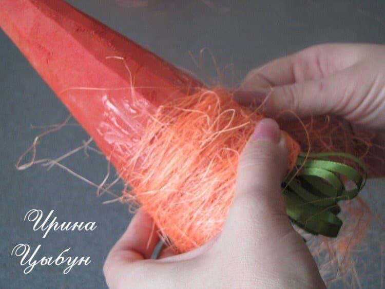 С помощью клея и сизаля декорируем конус. Сизаль отрываем небольшим пучками и приглаживаем влажной рукой. Чем плотнее укладывать,тем красивее будет ваша ёлочка.