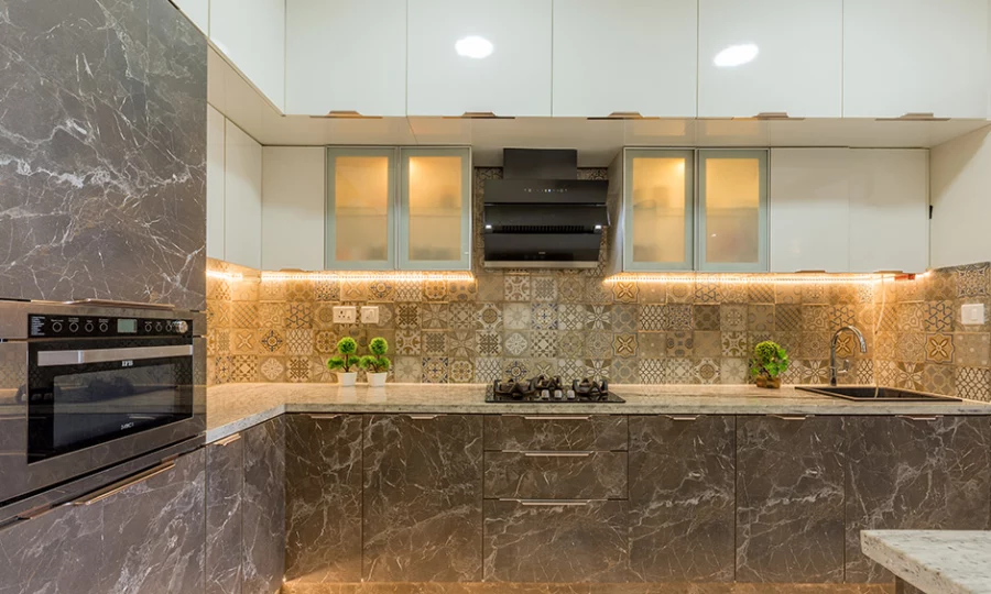 Кухня 1: Эта кухня от DesignCafe в Urban Greens, Бангалор, выполнена с роскошной каменной отделкой и белым глянцевым ламинатом, создающим поразительный контраст. Шкафы-шкафы с фасадом из матового стекла на верхних шкафах придают кухне роскошный вид и хорошо сочетаются с интерьером.