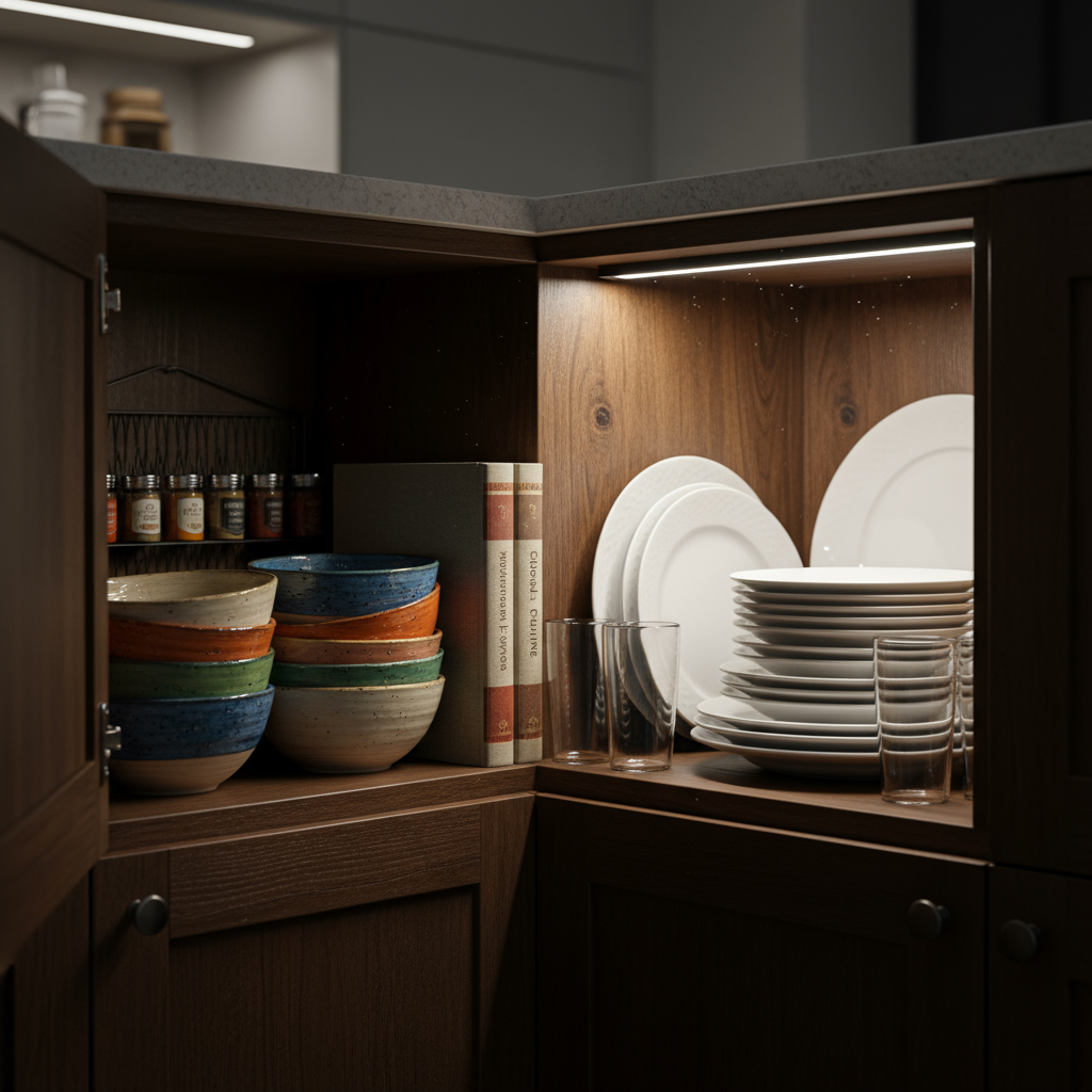Контрзаклинание: «Ритуал Полной Луны». Чтобы вернуть вещи из иного измерения, установите в этих шкафах вращающиеся полки-карусели или выдвижные «волшебные уголки». Одно легкое движение — и нужная кастрюля сама выезжает к вам в руки, словно по волшебству.