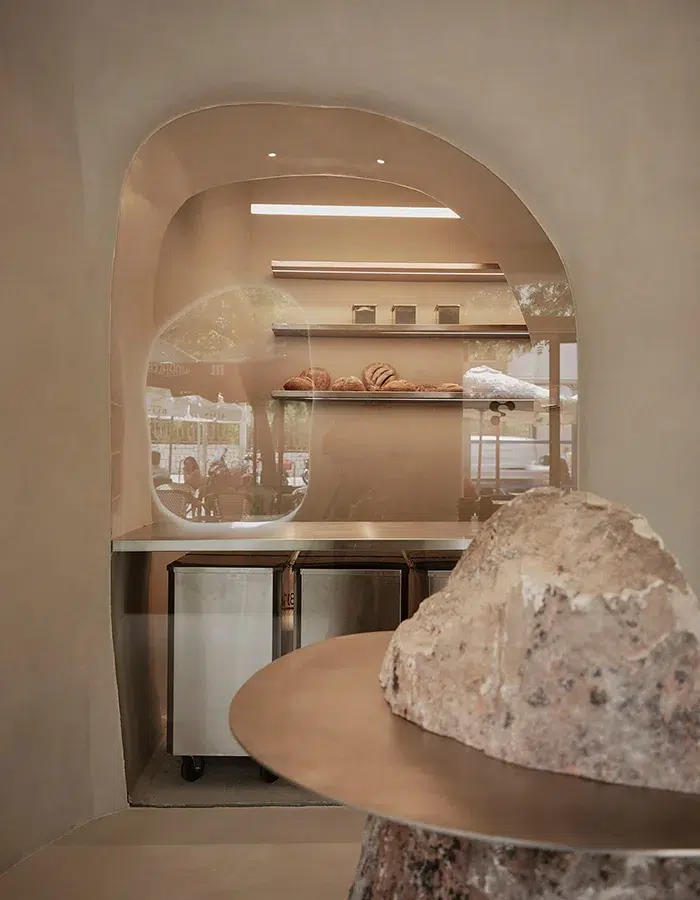 Название Fu.Ba (Future Bakery) полностью оправдывает концепцию. Студия Isern Serra превратила пространство в монохромный грот, где главную роль играют тактильность и свет. В центре композиции — необработанная каменная глыба, рассеченная столом из хирургической нержавеющей стали. Стены покрыты слоем извести создают модный сейчас обволакивающий эффект. Баланс между футуризмом и архаикой с неожиданным ощущением сакральности.