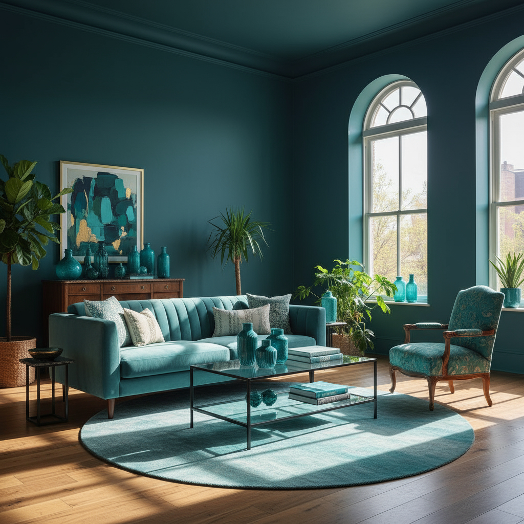В интерьере Transformative Teal проявляет себя как удивительно гибкий игрок. Он достаточно глубок для акцентной стены или бархатного дивана, но при этом в меру спокоен для кухонных фасадов или ванной комнаты. Он идеально сочетается с теплыми древесными текстурами, латунью и приглушенными терракотовыми оттенками.