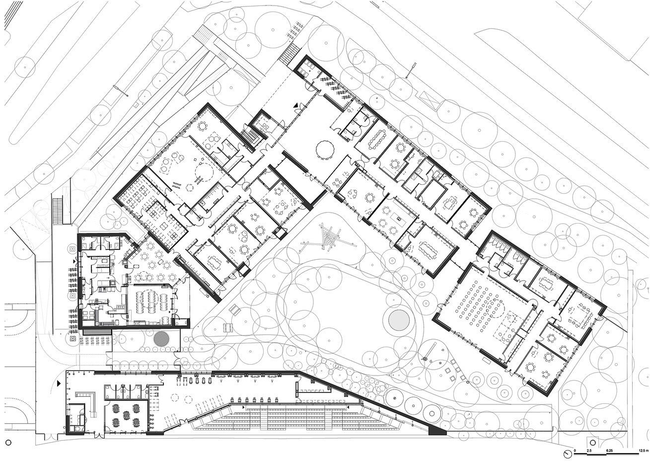 Дорожки вьются между недавно посаженными деревьями, естественным образом расширяя территорию школы и превращая её в парк. Детский сад превращается в прирученный лес, засаженный дубами, ясенями, клёнами и вязами, а также полянкой, на которой можно свободно играть. Проект предлагает игровой и захватывающий подход к обучению, который глубоко укоренён в природе и живом мире.
