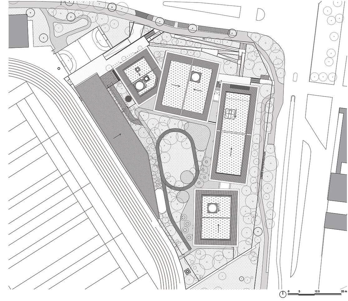 Спортивный комплекс, естественно, дополняет этот архитектурный стиль. Трибуна на 300 мест, идеально ориентированная, обеспечивает оптимальный комфорт для зрителей. Пологая крыша спускается к зоне отдыха, сохраняя освещение и виды во внутренних дворах. Интегрированный в единое целое, он укрепляет идею общего, объединяющего поколения и открытого общественного пространства в самом центре города.