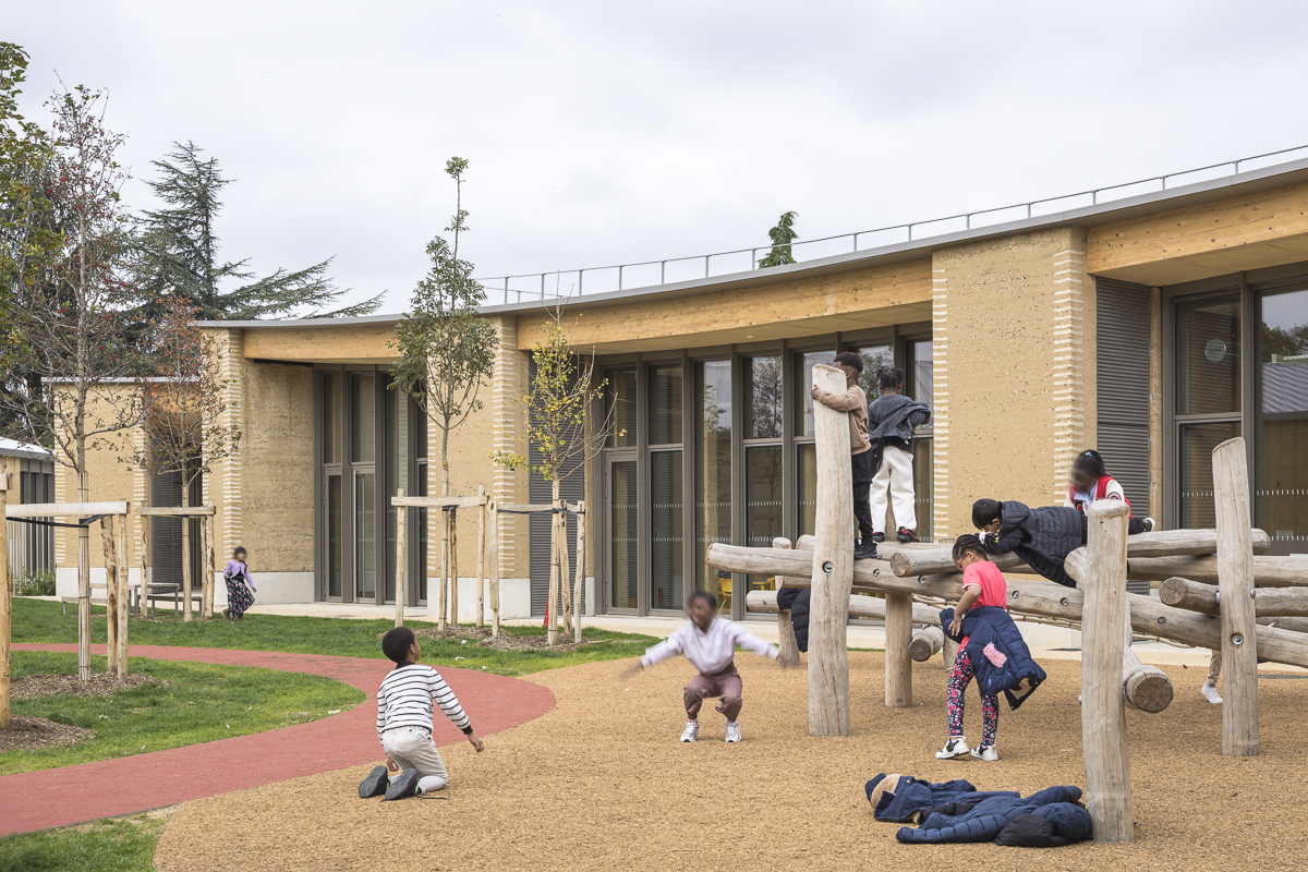 Идеально вписанный в естественную топографию участка, проект повторяет склон без искусственных изменений. Пять объектов - детский сад, начальная школа, центр присмотра за детьми, кафетерий и спортивная площадка - расположены вокруг центрального садового дворика, защищённого от улицы, но открытого пейзажу. Соединённые изящными застеклёнными переходами, эти автономные объёмы способствуют естественному освещению, визуальным связям и взаимосвязи с жилой средой. Как аллегория материалов, из которых состоит Parc des Loges, фасады выполнены из несущего утрамбованного грунта, а внутренний каркас полностью деревянный.