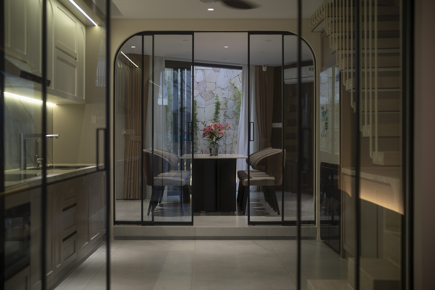 Суженная задняя часть участка преобразована в небольшой сад, создавая отступ, который позволяет дневному свету и воздушному потоку проникать глубже в интерьер, одновременно открывая спокойный вид из обеденной зоны. На верхних этажах площади пола сведены к основным каналам циркуляции, образуя вертикальную пустоту, которая непосредственно соединяется с общей лестничной площадкой. Вдоль этого пустого пространства расположена система стеклянных блоков, образующих крестообразную композицию, позволяющую проникать мягкому дневному свету и создающую духовную фокусную точку, видимую из множества помещений по всему дому.