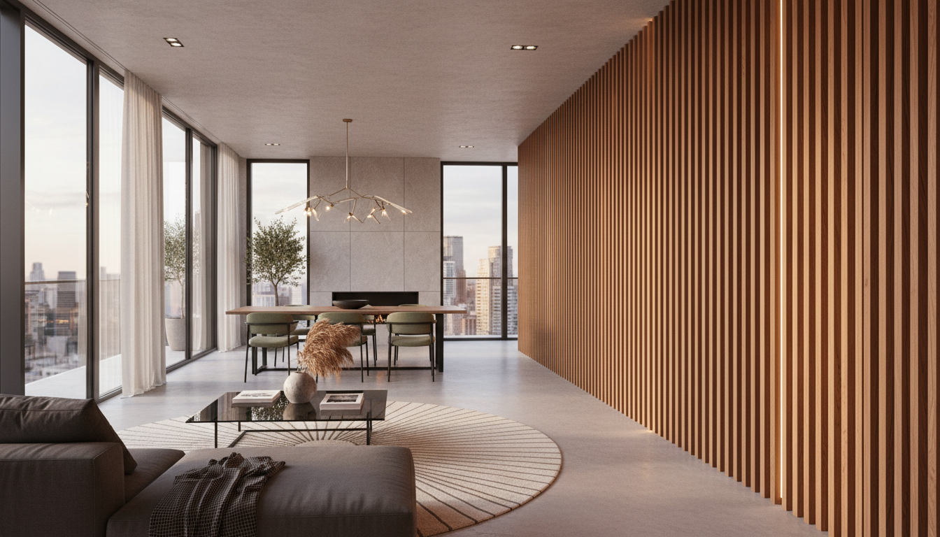 Вердикт-2026: рейки создают визуальный шум и дробят пространство, что противоречит новой доктрине «обволакивающего» интерьера. На смену им приходят сложные шпонированные панели (буазери в современном прочтении), гладкие стены с глубоким цветом или крупноформатный керамогранит с активной текстурой. Если текстура дерева необходима, предпочтение отдается спокойным, цельным поверхностям, а не дробному ритму.
