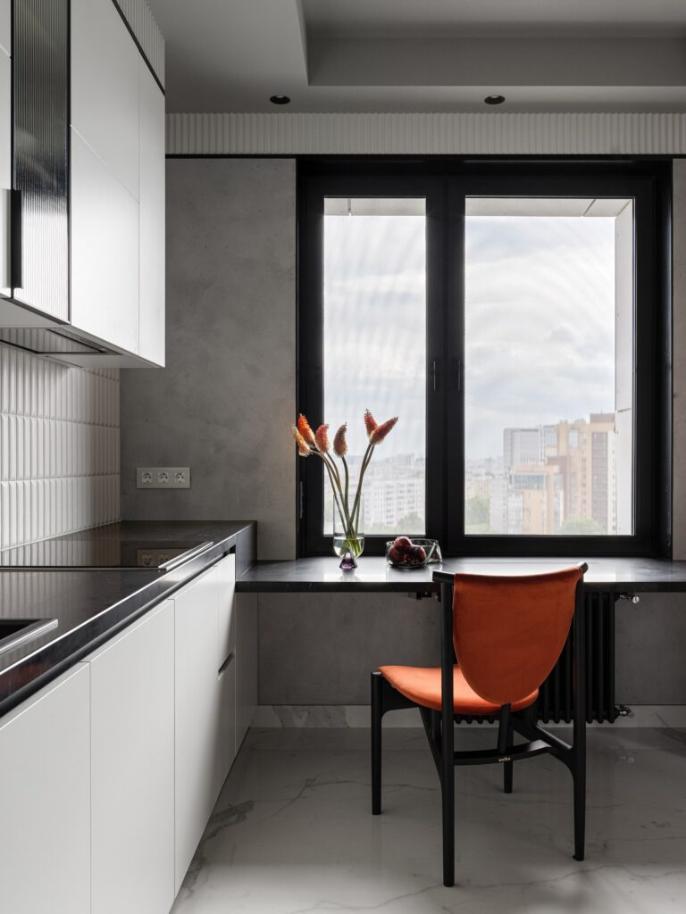 Archbutik: Выполнена очень сложная работа по столешнице на кухне. Для нас было важно иметь единое полотно столешницы, которое переходит в стол и подоконник. Нам удалось не нарушить первоначальную задумку и в команде со столярной мастерской и со специалистами по камню разработать сложные узлы крепления и оставить их незаметными. Особая гордость состоит в том, что мы ушли от опор в пол и наша столешница у окна как будто парит не имея опоры — этого мы достигли с помощью усиленных кронштейнов и опоры на подоконник и мебельную конструкцию.