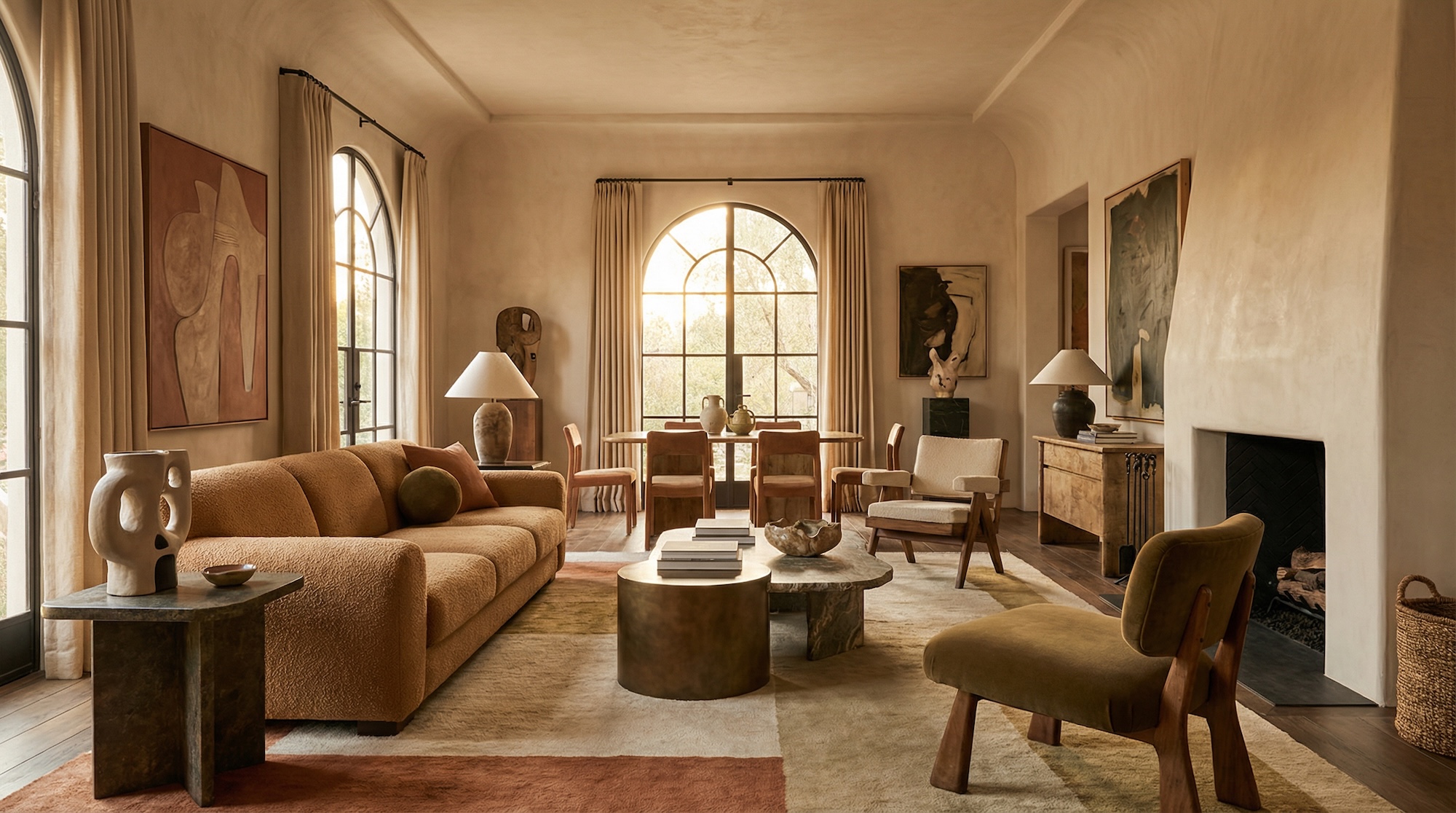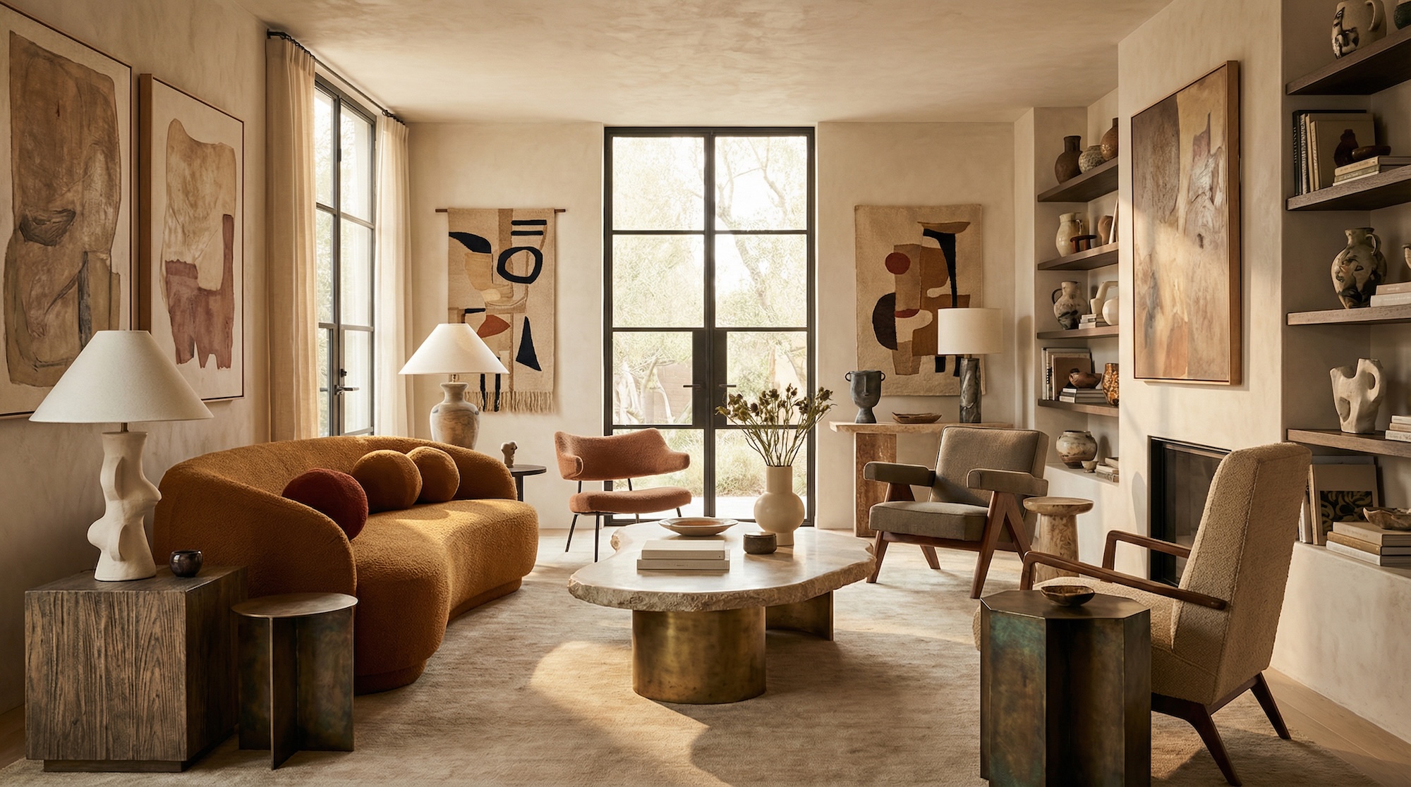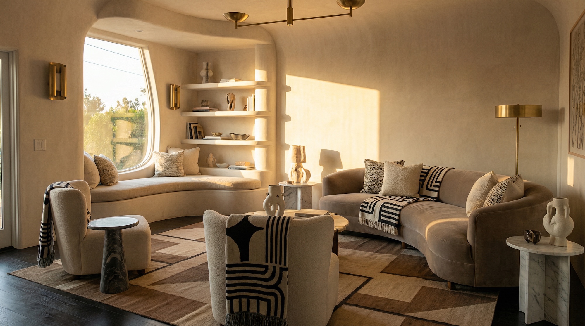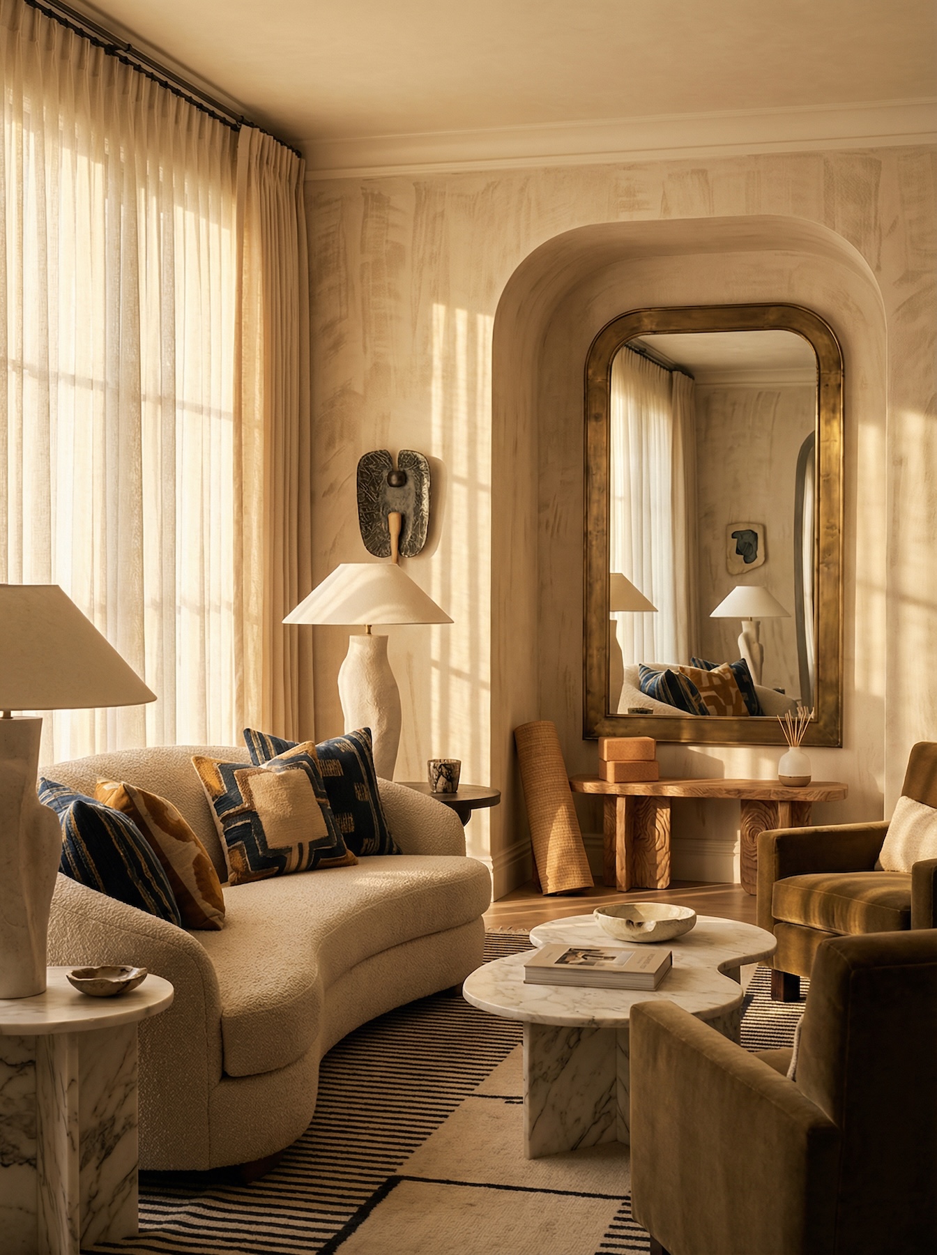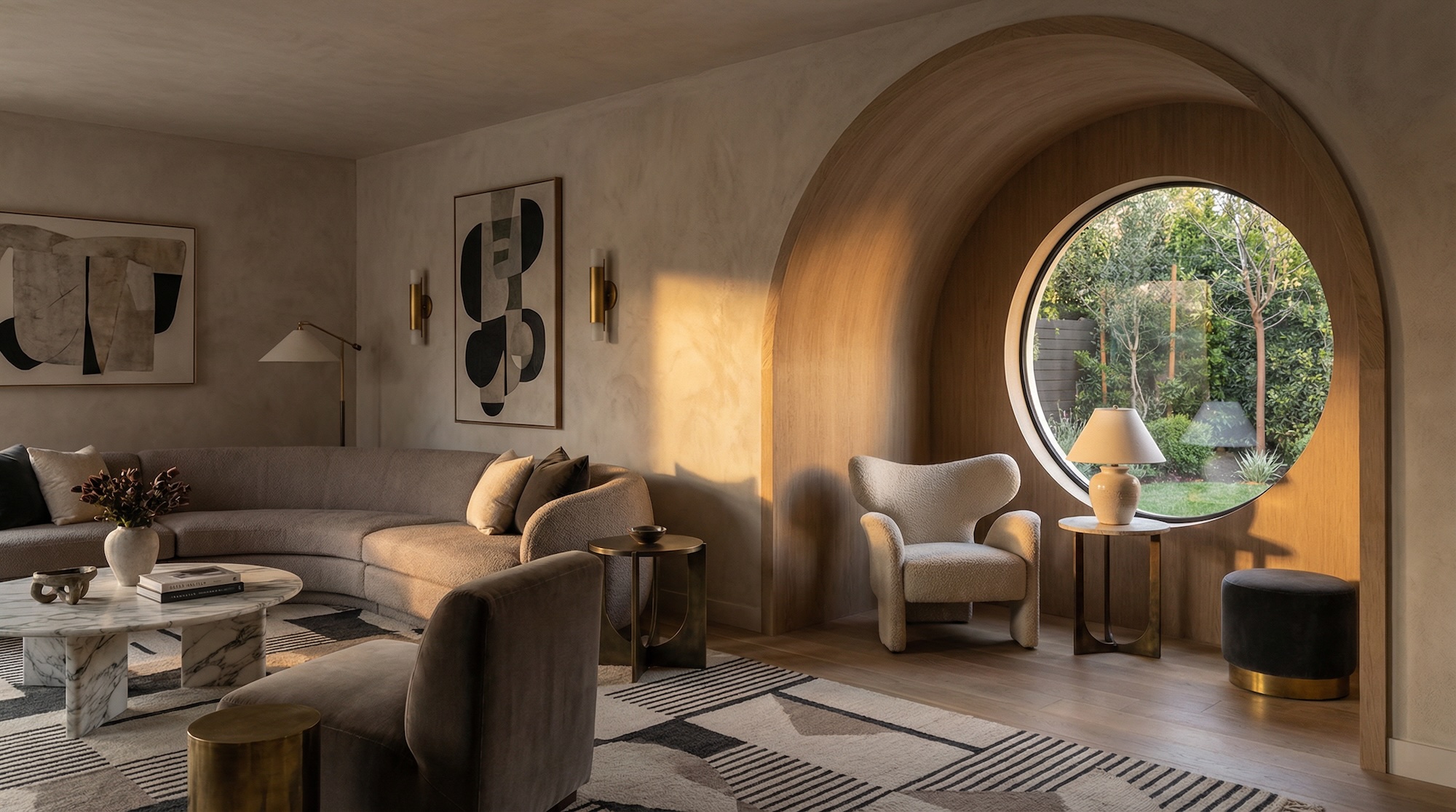 Центр композиции — низкое кресло с глубокой посадкой (например, по типу Togo или Pacha) или напольные подушки дзабутон. Обязателен приставной столик для воды и телефона (который нужно отложить).