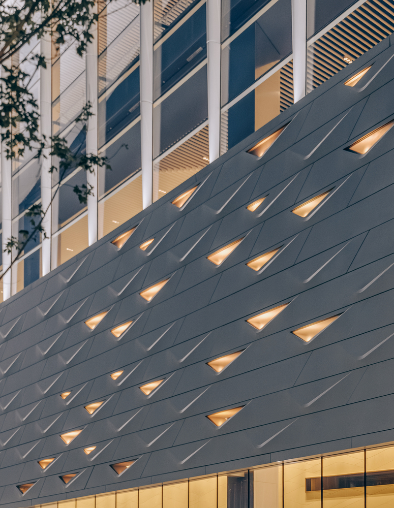 Под широким карнизом фасад превращается в монументальную картину, изображающую птиц в полете. На восточной стороне огромные стальные панели, покрытые эмалью, прорезаны треугольными отверстиями, рисунок которых напоминает взлетающие стаи, балансируя между светом и тенью. На северном и южном фасадах этот мотив постепенно трансформируется в ромбовидные окна, которые привносят в офисы дневной свет и прозрачность.