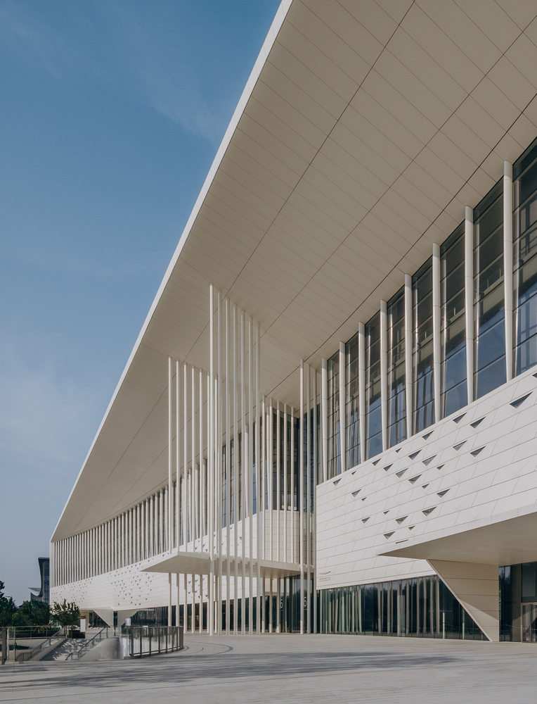 Основной объём представляет собой переосмысление традиционного китайского летучего карниза с использованием современной архитектурной лексики. Вогнутая кривая переходит в ровную наклонную плоскость, образуя непрерывный карниз, простирающийся с юга на север. Внизу фасад плавно изгибается, создавая едва уловимое напряжение, из-за которого кажется, что его концы устремлены ввысь, приковывая взгляд к одной точке.