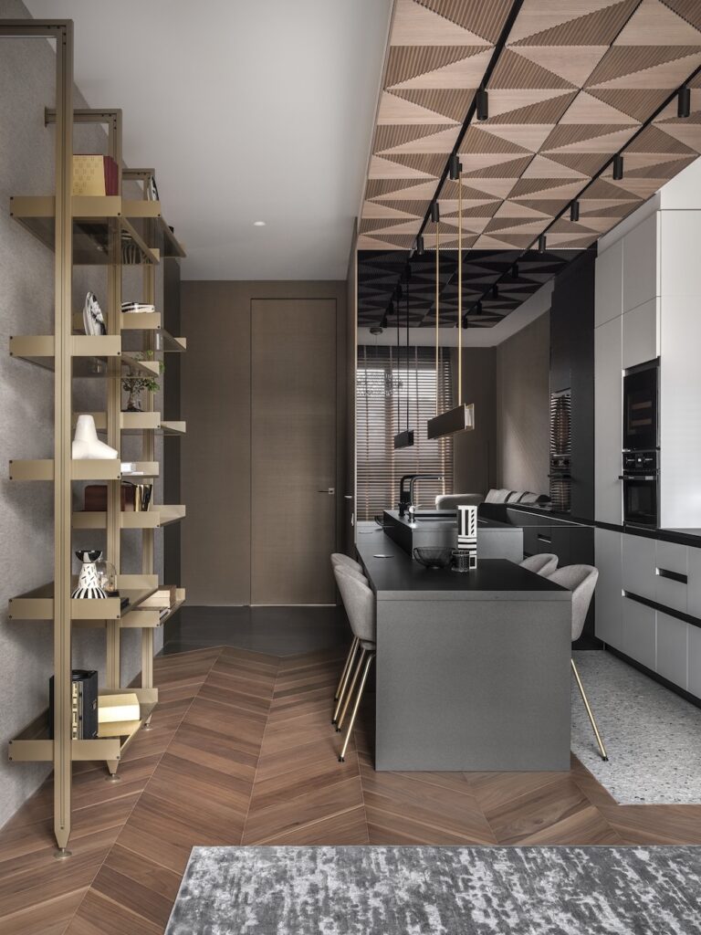 Кухня Arrital, столешница Fenix, фартук керамогранит MaxFine, стулья Bontempi Casa, диван и ковер Ditre Italia, люстра MOOOI, подвесной светильник Sovet, стеллаж UNION, текстильные обои Yana Svetlova, керамогранит в ТВ-зоне IRIS CERAMICA, аксессуары Ceramum