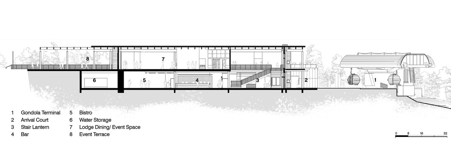 На верхнем этаже расположены ресторан и открытый зал, где зимой можно обслуживать лыжников, а также проводить свадьбы и другие мероприятия. Стремясь создать ощущение пребывания на открытом воздухе, команда дизайнеров работала над тем, чтобы обеспечить плавный переход от дерева, стали, камня и стекла, дополняя природную красоту региона в равной степени просторными и изысканными интерьерами.