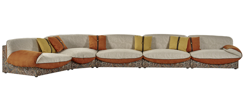 Диван и кресло Retrò (из них хорошо составить сет для гостиной) объединяют в себе мотивы mid century и классический пейсли. Необычное сочетание сначала вызывает вопросы, но потом понимаешь, что дизайн здесь работает как раз на контрасте, подчёркивающем образ.