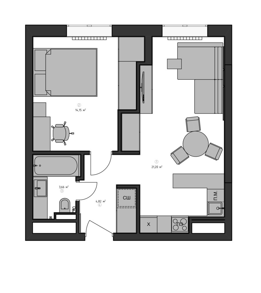 Монохромный интерьер для студентки: 43 кв.м. с контрастными акцентами