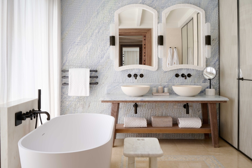 У марки Lithos Design, работающей с натуральным камнем, это, в частности, отделочные панели, выполненные из мрамора Кальцит Блю. Он впервые появляется в коллекции бренда, и впоследствии его планируют использовать также для других моделей.