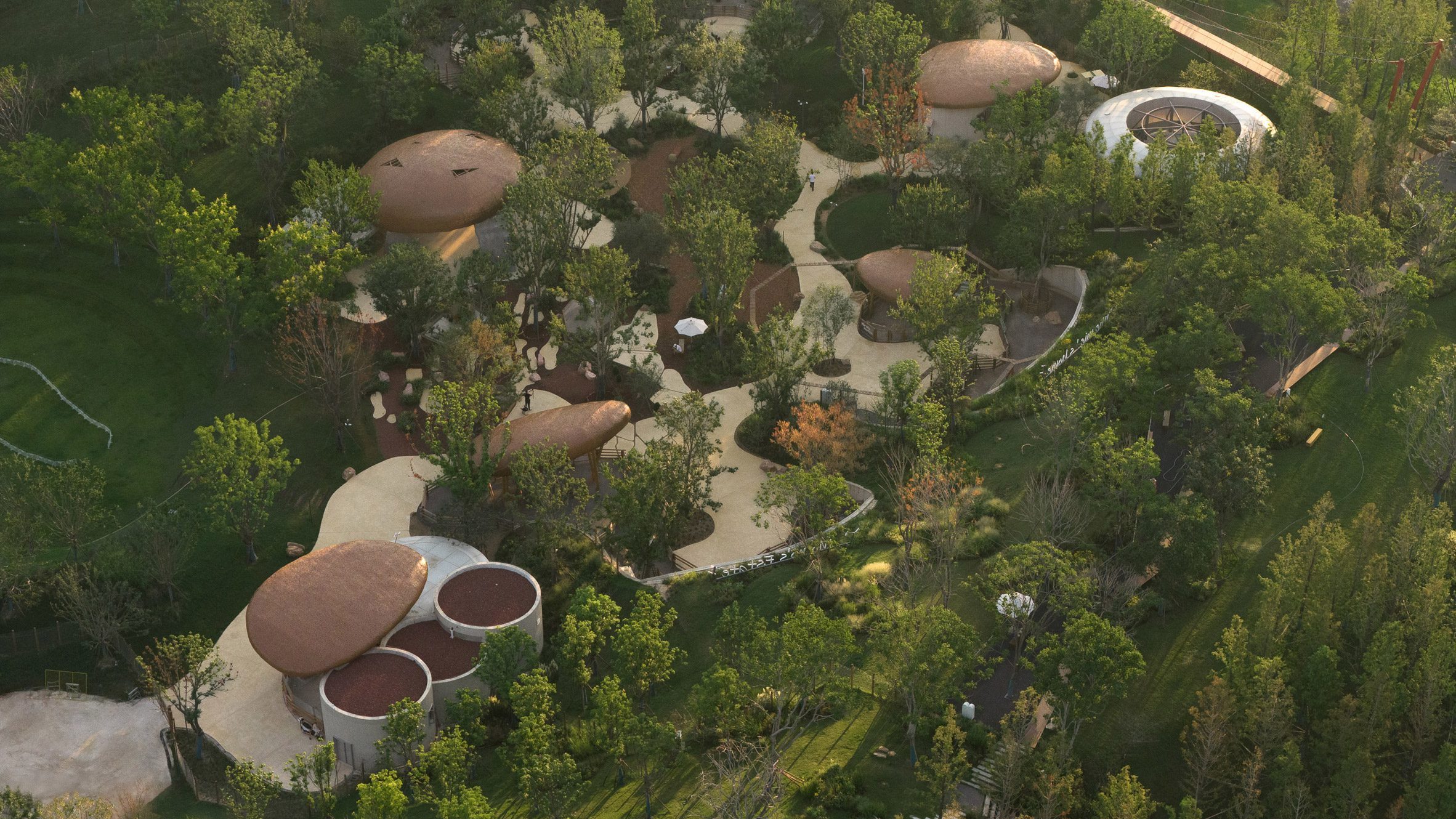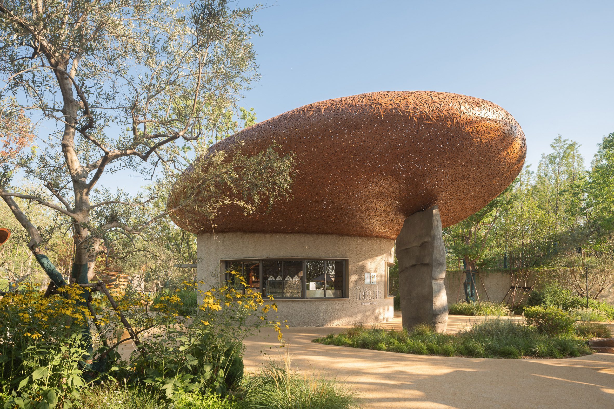 Над крышей каждого из этих зданий возвышается плетёный бамбуковый навес в форме валуна, концы которого разной длины опираются на искусственные стоячие камни. В самом большом навесе над мастерской на ферме были проделаны треугольные отверстия, а нижняя часть валуна была срезана, чтобы придать ему куполообразную форму. Многие открытые площадки должны были быть приспособлены для проведения разнообразных коммерческих и культурных мероприятий, поэтому компания Various Associates предусмотрела зоны для отдыха на тюках сена, каменные валуны и деревянные платформы, которые могут стать импровизированными сценами.