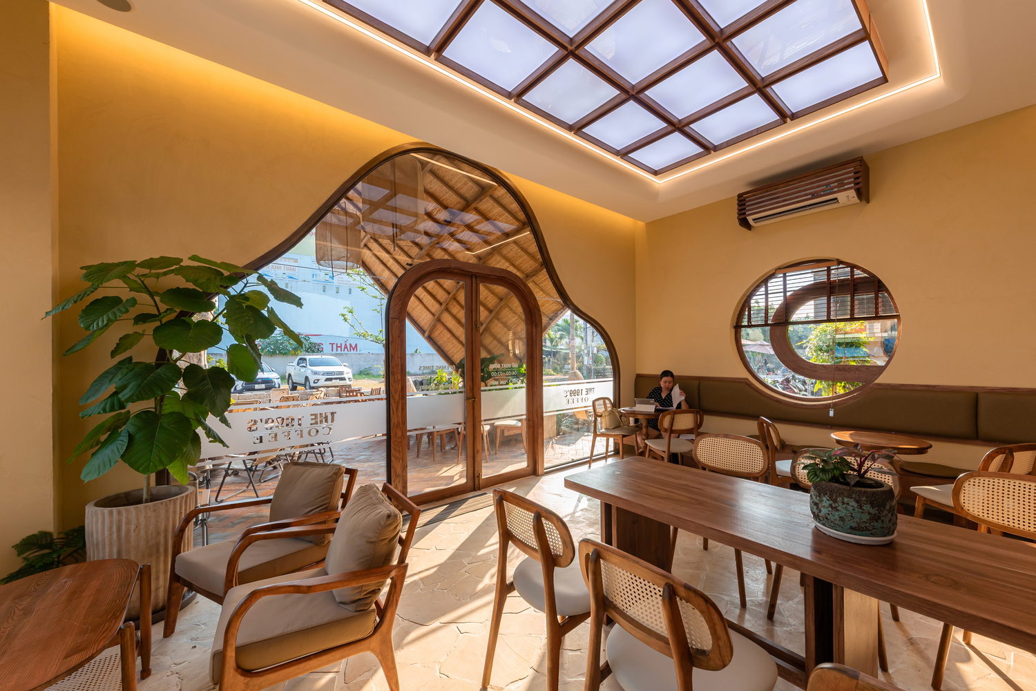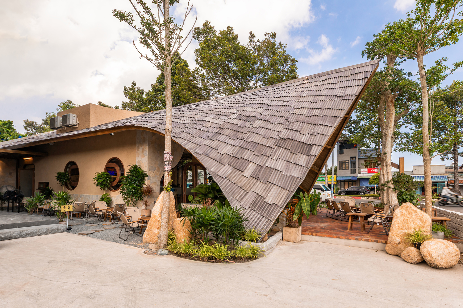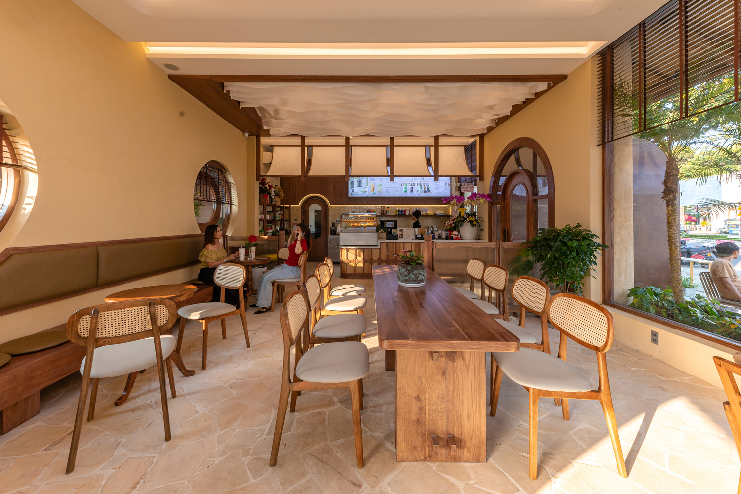 В оформлении, дополняющем пышную растительность, окружающую здание, использована палитра натуральных и традиционных материалов, в том числе камень, обожжённый кирпич, плетёные панели из тростника, натуральное дерево и текстуры утрамбованной земли. Каждый материал используется с особой тщательностью, чтобы сохранить его первозданный характер, создавая в то же время современную атмосферу. Такой тактильный подход гарантирует, что кафе остаётся тёплым, доступным и визуально привлекательным для каждого посетителя.
