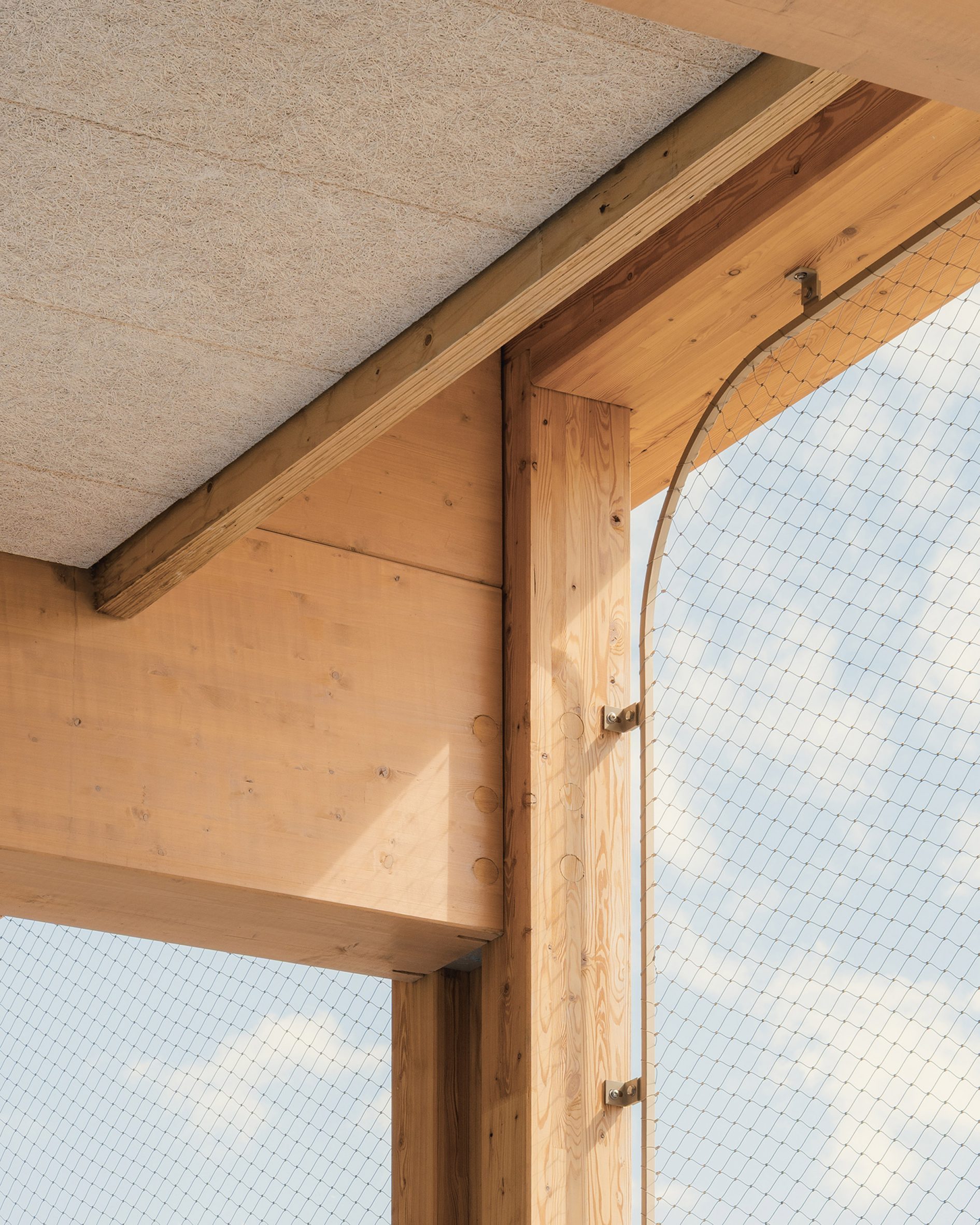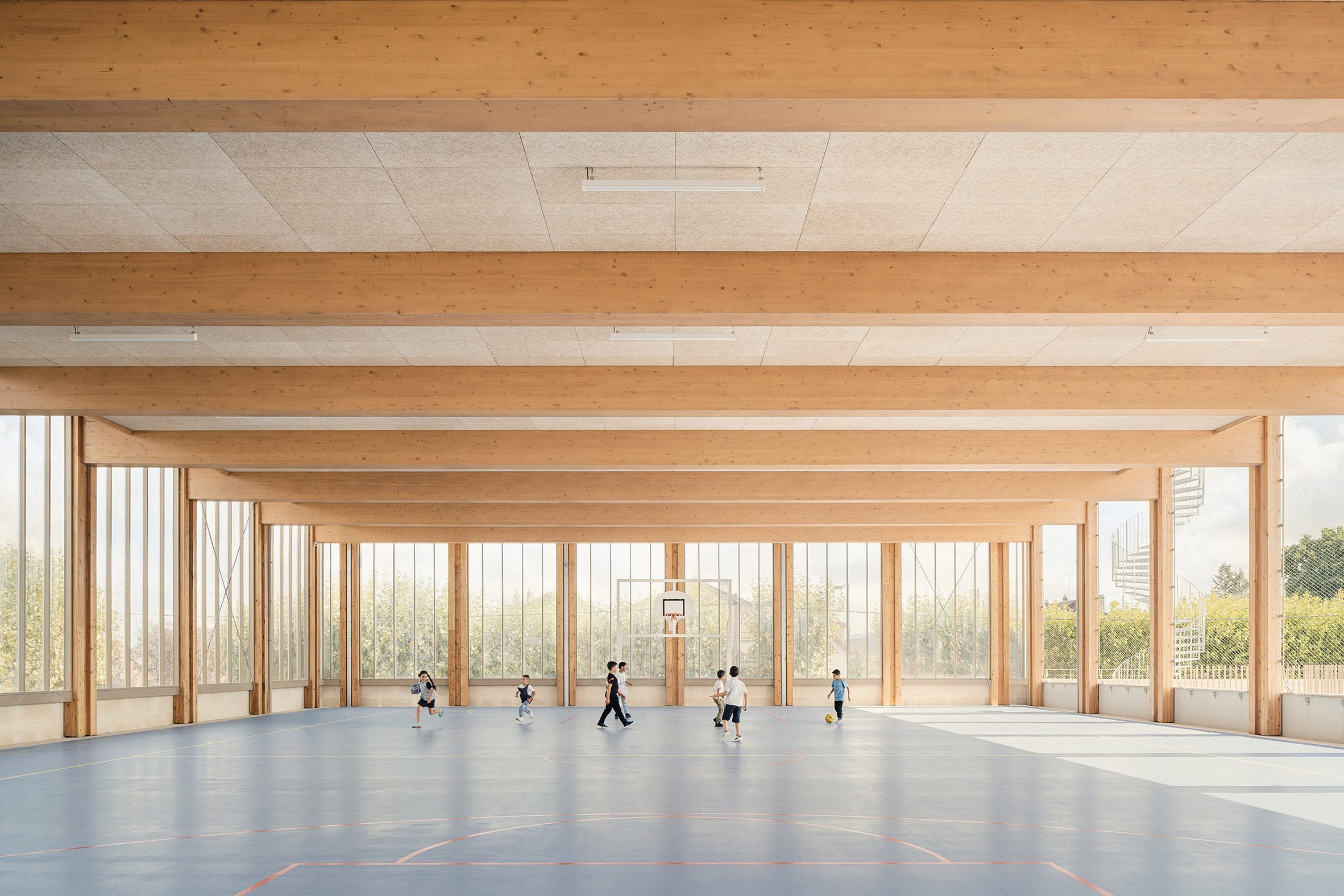 На крыше этой несущей конструкции из камня и дерева школы в Франции расположена спортивная площадка. В школе Groupe Scolaire Simone Veil, расположенной в парижском пригороде Трембле-ан-Франс, на площади 2400 м2 находятся восемь классных комнат, столовая, административные помещения, а также спортивная площадка, которой пользуются местные общественные организации. Архитектурное бюро Le Penhuel & Associés из Парижа использовало для строительства школы палитру биоматериалов, в том числе древесину, местный известняк и глиняный кирпич, что отражает их убеждение в том, что образовательные учреждения должны демонстрировать экологичные методы строительства.