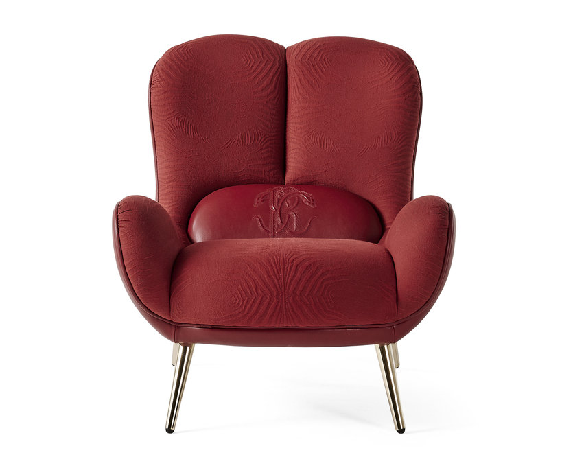 Хедлайнер, кресло Snake.2, фирменный дизайн Roberto Cavalli Home, в малиновом цвете выглядит ещё эффектнее, чем обычно. Ручки сделаны в виде золотых змеев. Змей — также из классической айдентики fashion-дома Roberto Cavalli.