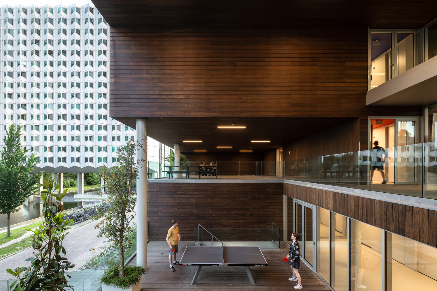 Архитекторы спроектировали "Сердце" как гибкое и привлекательное место, подходящее для всего: от занятий на свежем воздухе до совместных мероприятий. Ступенчатые платформы служат в качестве сидячих мест, террас или неформальных сцен, поощряя спонтанное использование. Наряду с сердцем здания, в нём продуманы общие внутренние функции, способствующие общественной жизни: общая гостиная с кухней и длинным обеденным столом, уютные рабочие уголки, комната отдыха с телевизором и прачечная. Стеклянная стена в полный рост соединяет гостиную с университетским городком.
