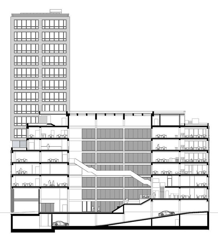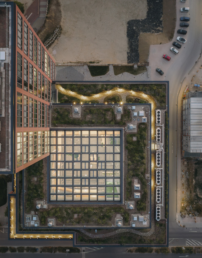 Здание спроектировано в стиле небольшого городка и включает в себя зоны для встреч и обмена мнениями, совместных обедов и кофе-брейков, а также для личного отдыха. На первом этаже расположены ресторан и конференц-залы, а на верхних этажах расположены офисные помещения, которые можно арендовать, с зонами для совместной и сосредоточенной работы. Они спроектированы как зоны общего пользования, доступные для всех арендаторов, в то время как пышно озеленённая терраса на крыше окружает здание, обеспечивая пространство для отдыха.