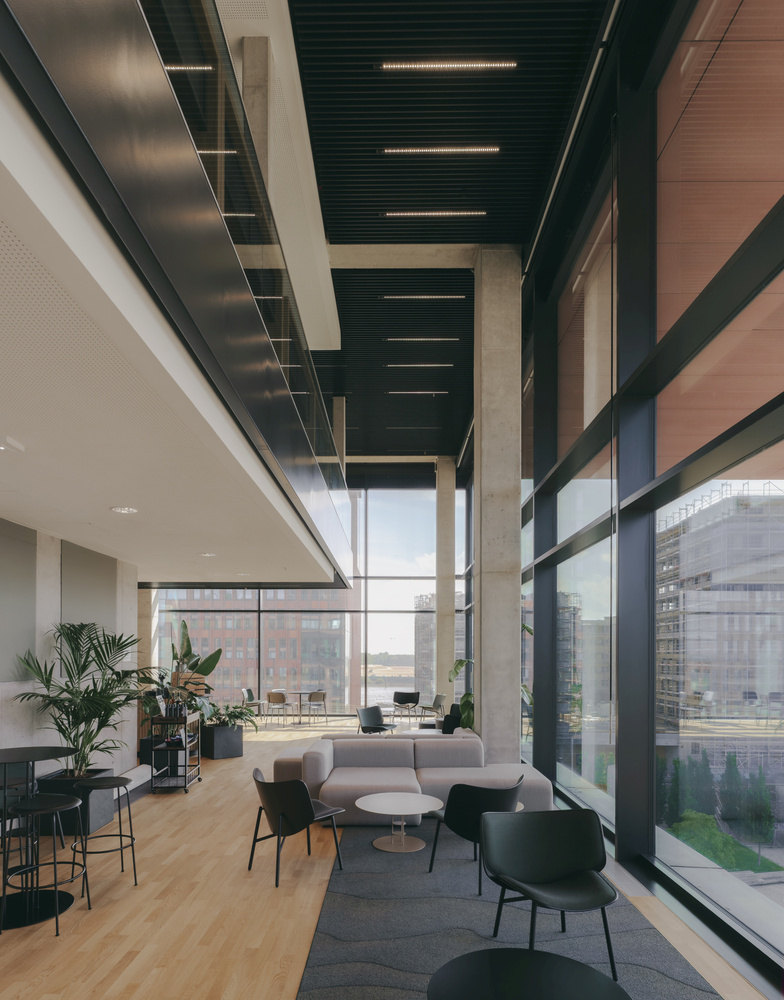 Через атриум и большие окна в интерьер проникает много дневного света. В сочетании с растениями, натуральными материалами и цифровыми технологиями, это создаёт комфортную атмосферу для работы и общения.