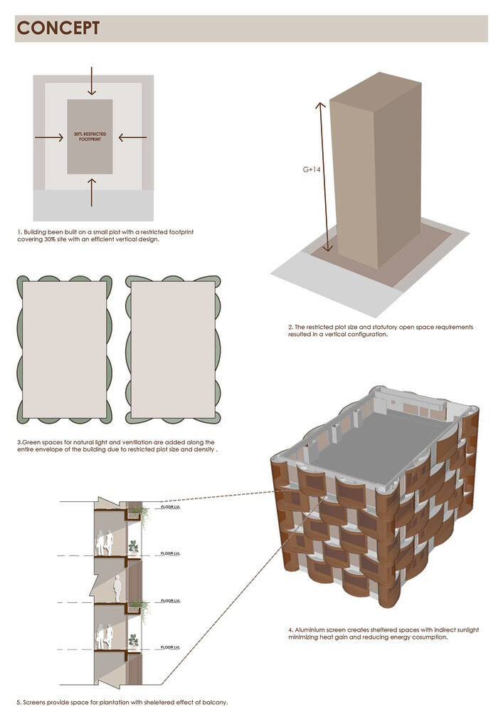 В Нагпуре, одном из самых жарких городов Индии, летом температура достигает 48°C. В соответствии с этим экстремальным климатом фасад здания выполнен в виде многослойной, чувствительной к изменению климата обшивки. Полукруглые открытые площадки и цветочные горшки, обшитые алюминиевыми жалюзи, чередуются по всему периметру, как горизонтально, так и вертикально. Это динамичное ограждение уменьшает прямой приток солнечного тепла, в то же время добавляя зелени вокруг здания, создавая затенённый, прохладный микроклимат для внутренних помещений.
