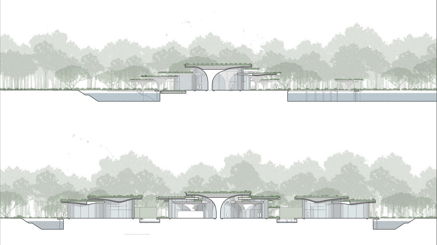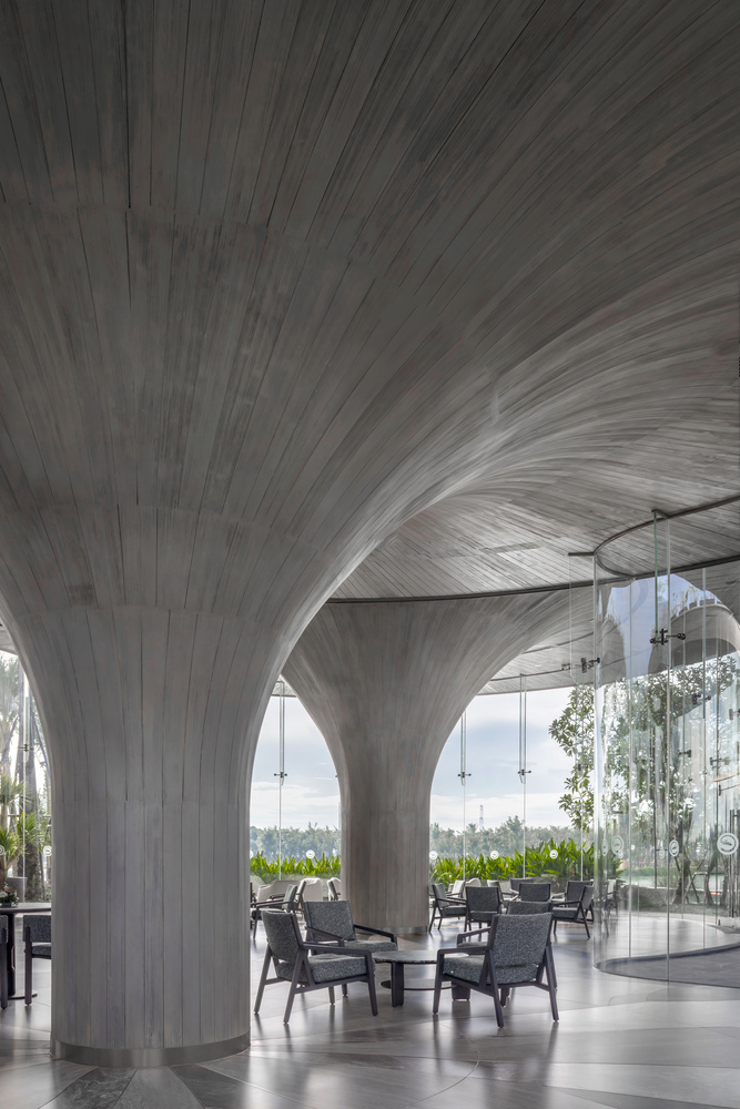 Высота крыш постепенно увеличивается к центру, где расположены более крупные модули, в то время как меньшие, более низкие крыши выступают наружу. Каждый модуль крыши функционирует как водосборная воронка, мягко отводя дождевую воду обратно в ландшафт, регулируя дневной свет и уменьшая прямое воздействие солнечных лучей. Благодаря этой интегрированной системе тропическая адаптивная архитектура выражается в гармоничном сочетании формы, экологии, энергии и функциональности.
