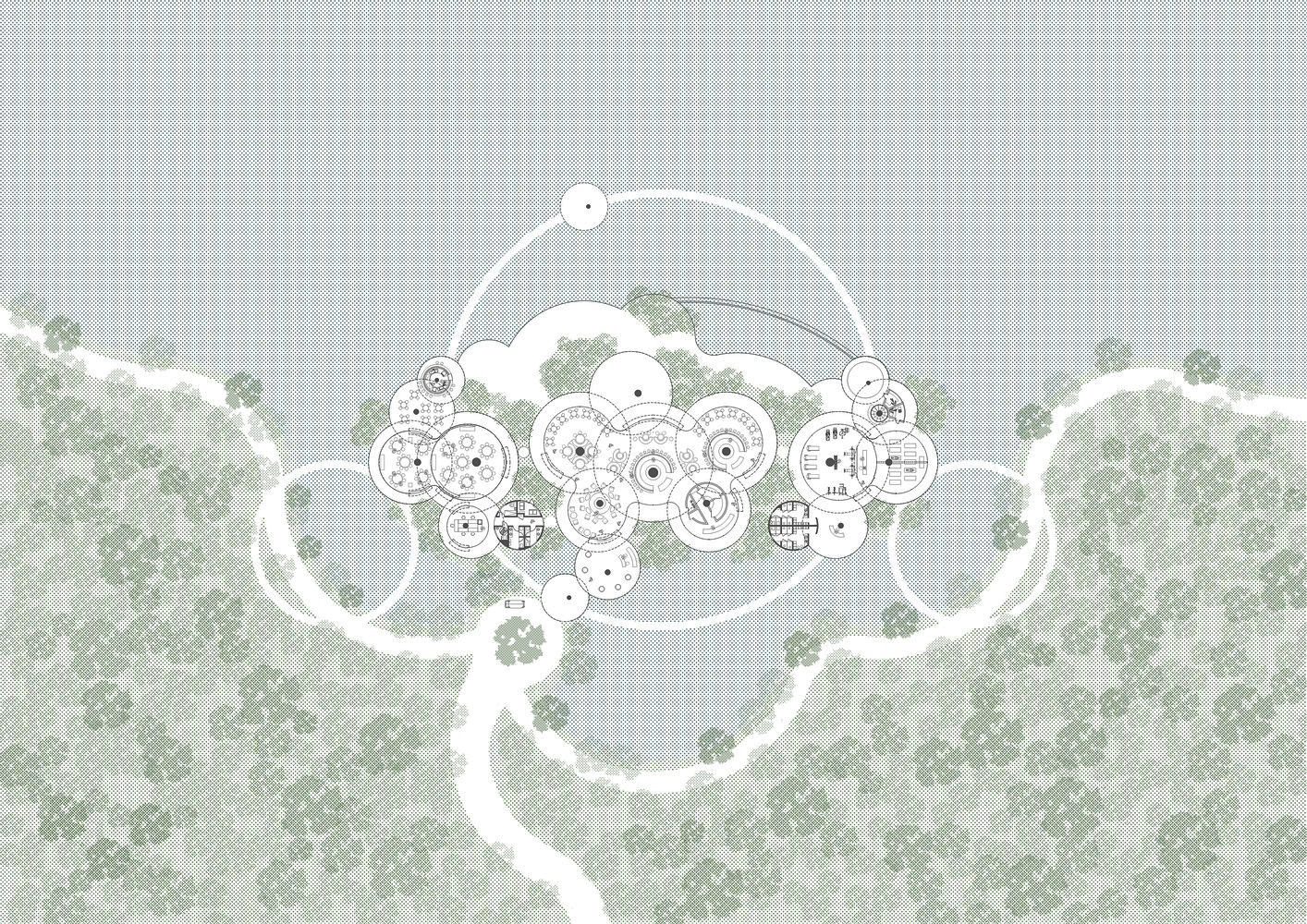 Руководствуясь этим подходом, здание отеля состоит из нескольких небольших помещений, расположенных под пологом леса на полезной площади около 2000 м2. Каждый функциональный блок расположен на разной высоте и соединён между собой изогнутыми дорожками и отражающими водными поверхностями, создавая пространственное путешествие между открытостью и замкнутостью, яркостью и тенью. Активные зоны, такие как ресторан и детская игровая площадка, выходят окнами на озеро, в то время как более тихие, включая спа-центр, лаундж и зоны для медитации, расположены в тени зелени. Издалека рассредоточенная планировка позволяет зданию визуально сливаться с ландшафтом, сводя к минимуму его присутствие и обогащая чувственные ощущения за счёт света, ветра и воды.