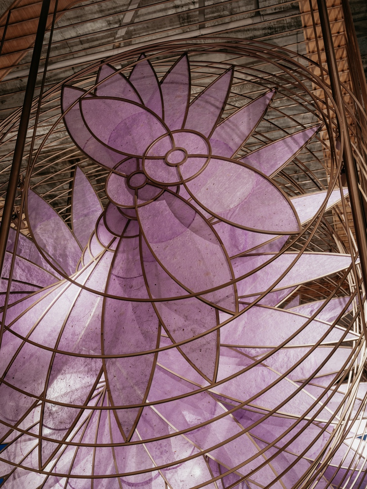 Над головой "корона" состоит из 39 модульных рам, расположенных по спирали, каждая из которых содержит полупрозрачный фиолетовый лепесток, изготовленный из переработанной бумаги xuan. Ночью освещение по периметру освещает края лепестков, превращая потолок в плывущую туманность. Система разработана с учётом экологичности: лепестки можно перекрашивать, а рамки можно использовать повторно.