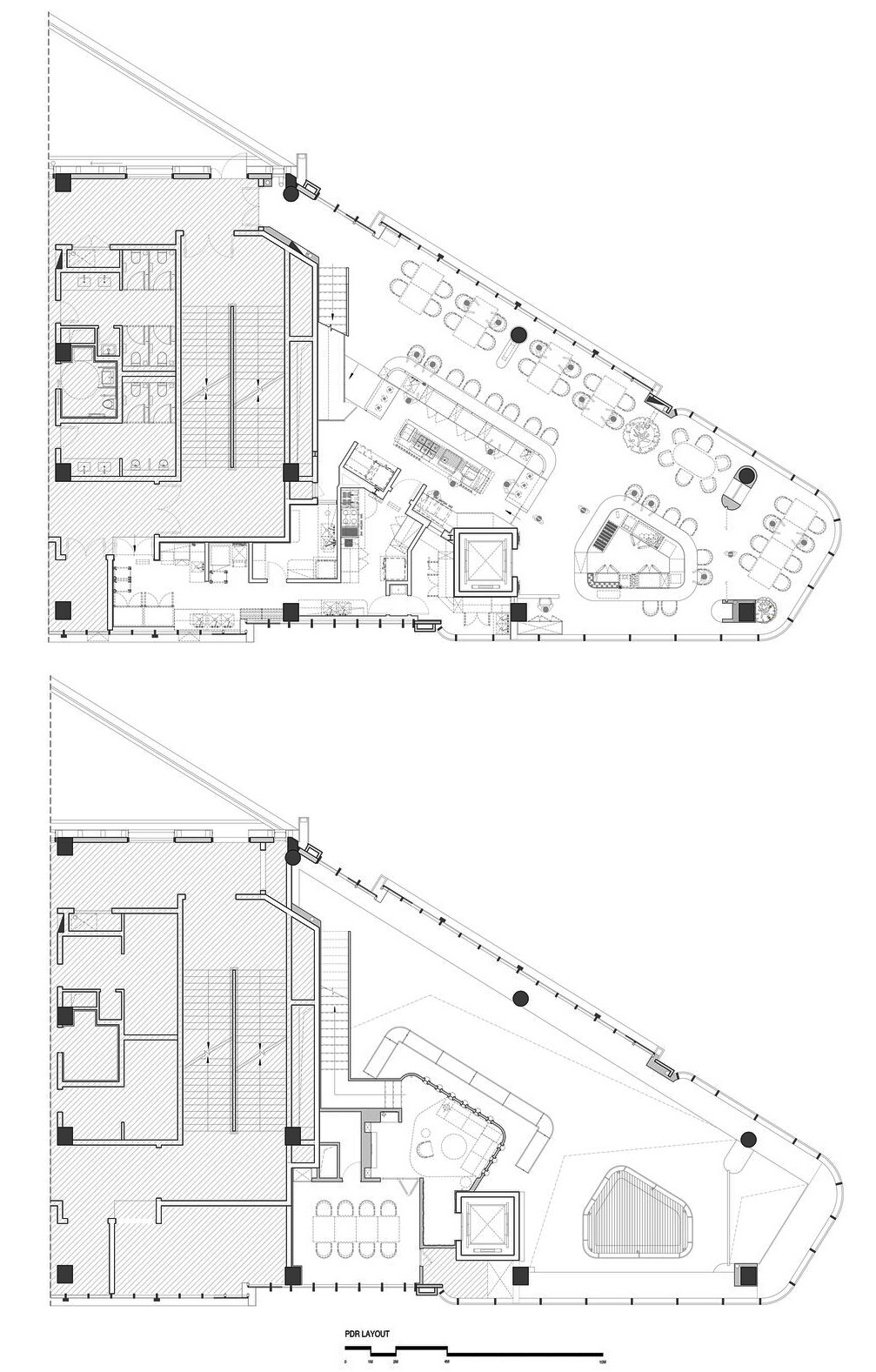 Вдоль окон расположены многослойные подвесные светильники, продолжающие цветочную тематику. В сочетании со структурными балками они превращают архитектуру в поэзию, а тонкие перепады высоты делают каждый из них уникальным. Под этим декоративным слоем расположены точечные светильники, обеспечивающие оптимальное освещение каждого стола.