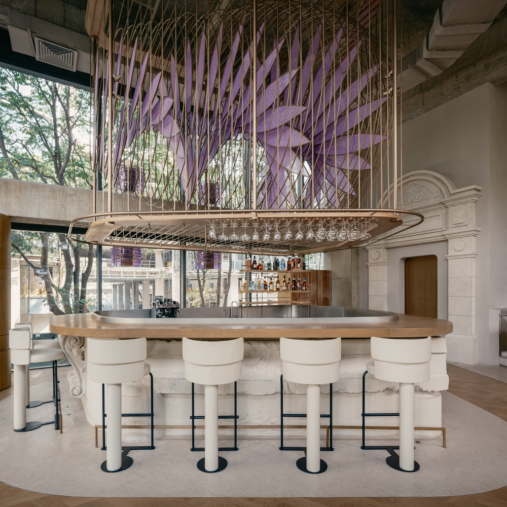 Все начинается с цветочного центра: круглая барная стойка и обеденная стойка открытой кухни образуют единую сцену. Это центральное пространство обеспечивает непрерывное обслуживание на 360 градусов. Посетители, сидящие за стойкой, находятся на расстоянии вытянутой руки от кулинарного действа и непосредственно взаимодействуют с шеф-поварами. Мягкий ореол света вдоль основания барной стойки перекликается с потолочной инсталляцией, создавая эффект погружения в атмосферу. Тактильная отделка бара и прилавков из глины ручной работы напоминает слоистый камень, придавая помещению атмосферу ремесленничества.