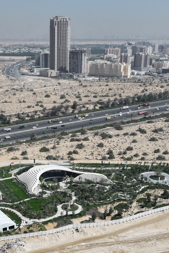 Каждый аспект здания разработан с учётом климатических условий ОАЭ. Удлинённые карнизы затеняют фасад, уменьшая приток солнечной энергии и повышая энергоэффективность. Южное водоснабжение способствует пассивному охлаждению, снижая непосредственный микроклимат. Окружающая лесная экосистема, спроектированная с использованием местных и адаптивных видов, способствует более низкой температуре окружающей среды в сообществе по сравнению с прилегающей пустынной зоной, доказывая, что экологический дизайн может напрямую повысить комфорт в городах.
