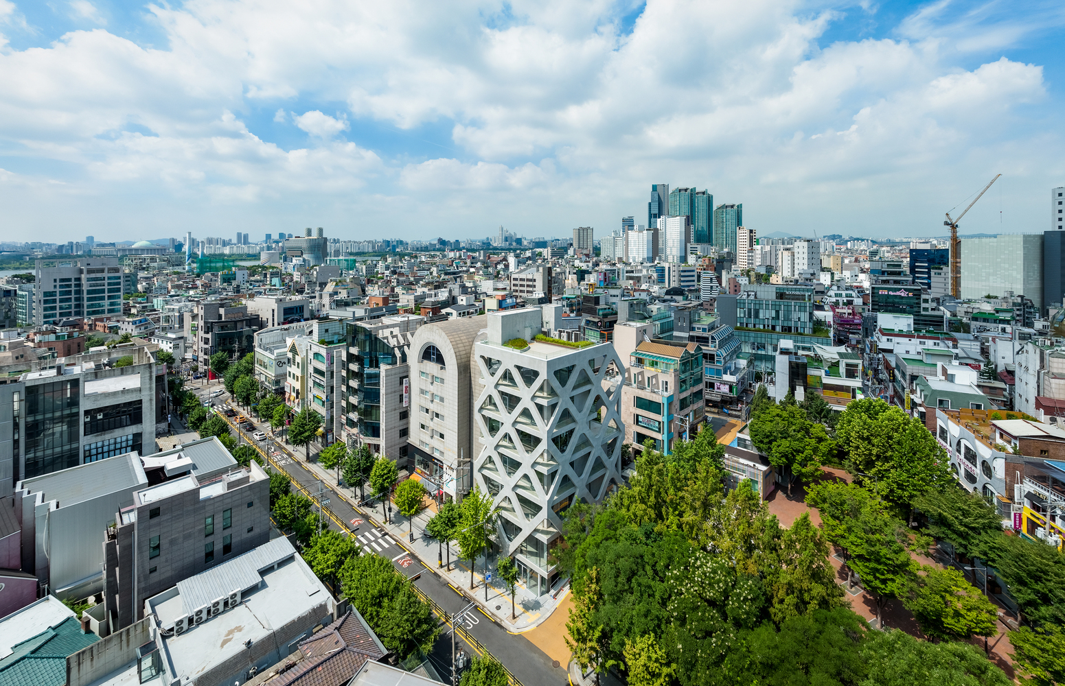Участок, расположенный прямо перед этим общественным и культурным пространством, представляет собой проект, который не только служит фоном для культурного контекста района, но и должен выполнять коммерческую роль соседского объекта. Самой большой проблемой в начале проекта было выяснить, как сделать так, чтобы внутренние помещения деловых объектов соответствовали яркой атмосфере района Хондэ. Поскольку три стороны участка визуально открыты, архитекторы рассмотрели взаимосвязь между окружающей средой, видимой снаружи, и ощущаемой изнутри.