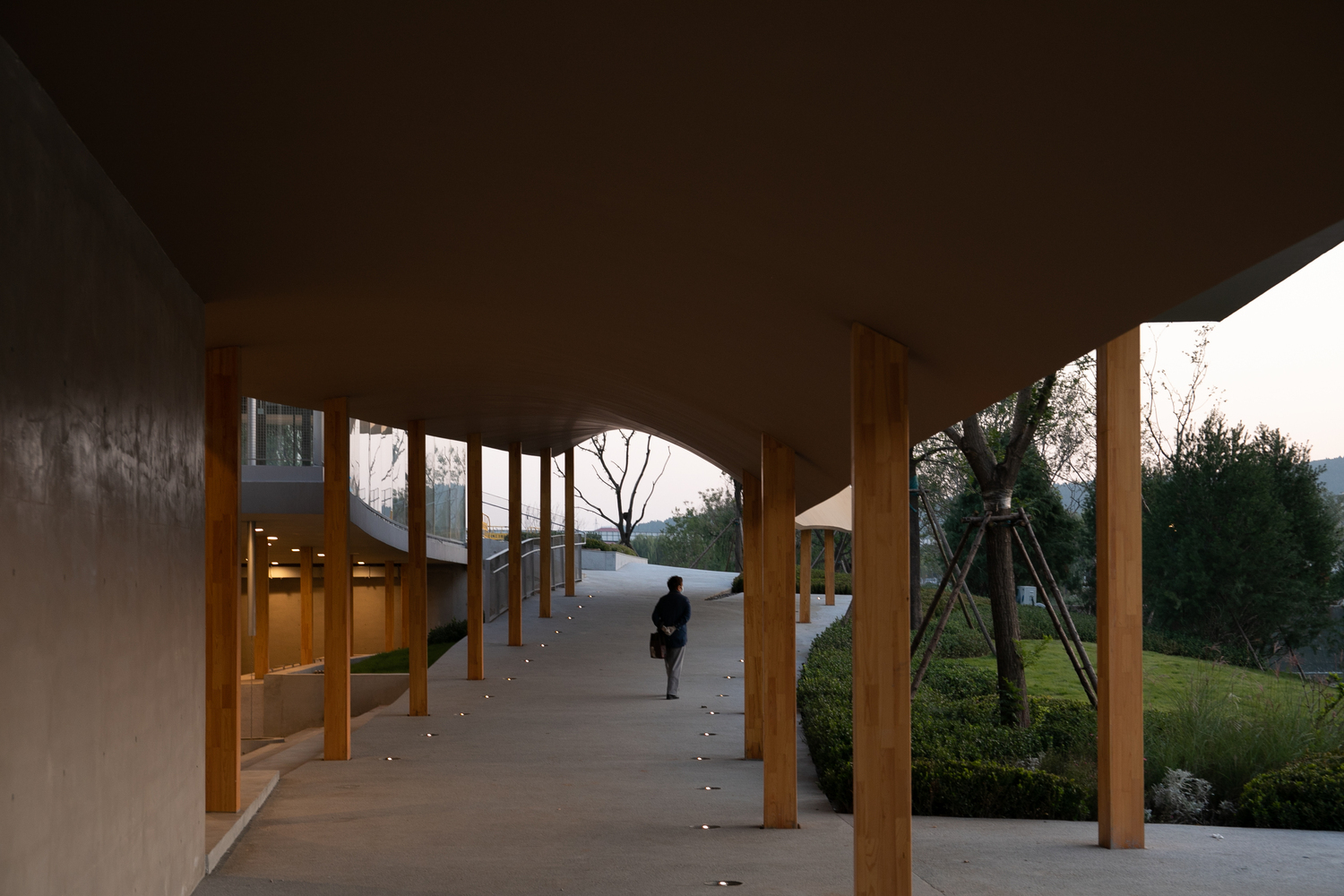 В отличие от традиционной изолированной циркуляции, эти коридоры пронизывают пространство под карнизами, пешеходные дорожки и плавно соединяющиеся переходы, усиливая взаимодействие между архитектурой и ландшафтом. Следуя естественному рельефу, коридоры пересекаются, сходятся и направляют движение - ведут посетителей с первого этажа на второй - прежде чем выйти из здания. В промежутках, образованных волнистыми, переплетающимися коридорами, приживаются растения, а пересечение дорожек образует центральный внутренний двор, естественное место для встреч.