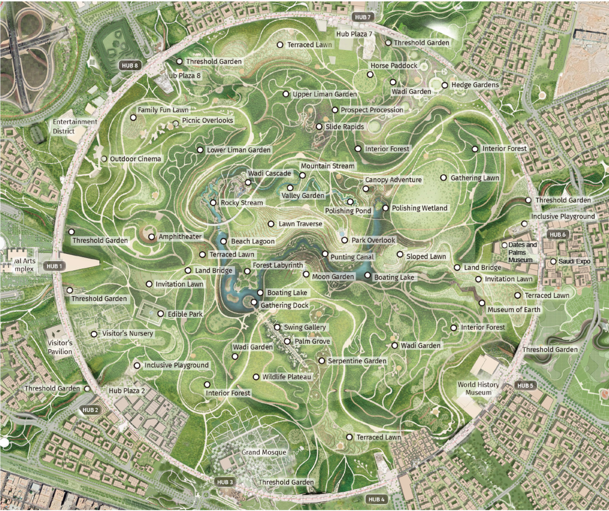 Согласно генеральному плану, парк будет организован вокруг сети разветвлённых долин, вдохновлённых региональными вади (сухих русел рек), которые сходятся в центральной части парка. Эта топографическая стратегия структурирует движение и распределяет по территории парка затенённые пешеходные коридоры, зоны отдыха и места для собраний. На территории планируется высадить около миллиона деревьев, а также внедрить экологические системы, включающие орошение очищенными сточными водами и восстановление почвы для улучшения водоудерживающей способности. Эти меры призваны смягчить последствия засушливого климата Эр-Рияда и представить проект как ландшафтную инициативу, так и инфраструктурный проект.