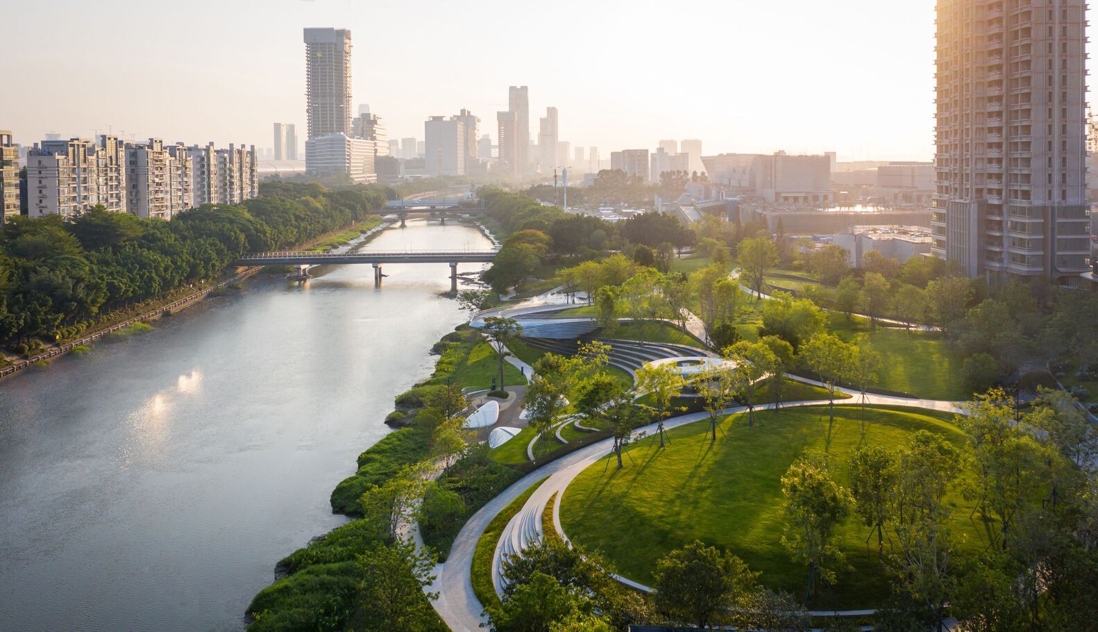 Благодаря глубокому пониманию требований по борьбе с наводнениями, проект смягчает существующие жёсткие насыпи, добавляя органические формы рельефа и извилистые дорожки вдоль реки, чтобы растворить линейные конструкции. Благодаря динамичным природным колебаниям уровня воды и тщательному подбору программ и видов посадок, парк создаёт гармоничную интеграцию ландшафта, людей и воды. Рельеф и пешеходные дорожки тщательно спроектированы таким образом, чтобы сохранить четырнадцать пышных деревьев, растущих на берегу реки.