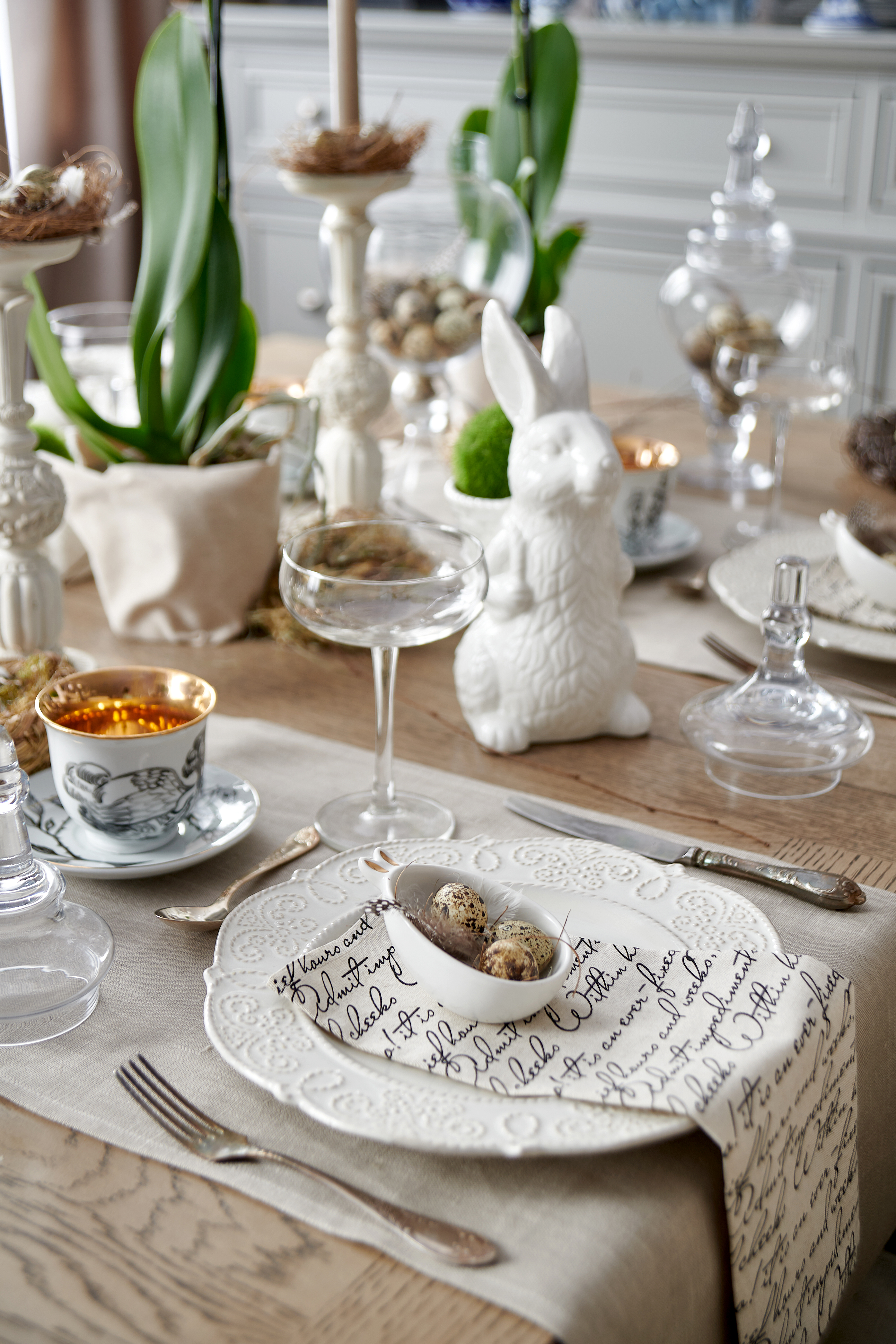 Керамические статуэтки зайцев, чайный сервиз с авторской росписью художника Дарьи Никитиной, птичьи перья – все эти детали дополнительно создают праздничную атмосферу. В эту сервировку в пасхальное утро достаточно будет добавить кулич и творожную пасху, чтобы вся семья могла встретить праздник, не нарушая православных обычаев и традиций.