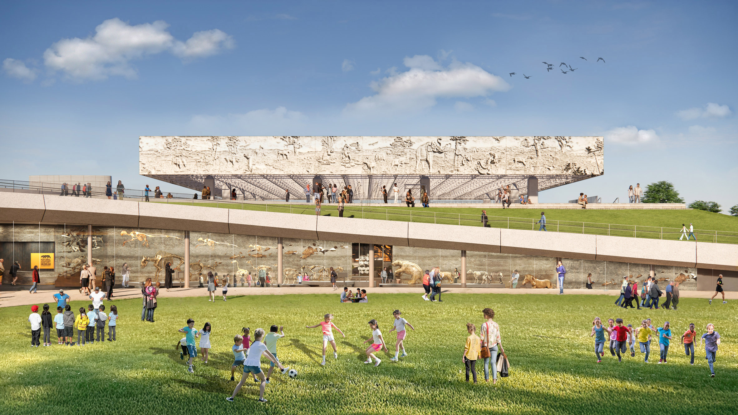 На рендерах изображён стеклянный фасад, расположенный под большим круглым насыпным холмом, который опоясывает основание музея с барельефами. Над фасадом проходит приподнятая дорожка, образующая небольшой крытый павильон, через который посетители попадают в новую пристройку. Ещё одна кольцевая дорожка расположена в центре участка, а другие ответвляются от неё и ведут к прилегающим территориям.